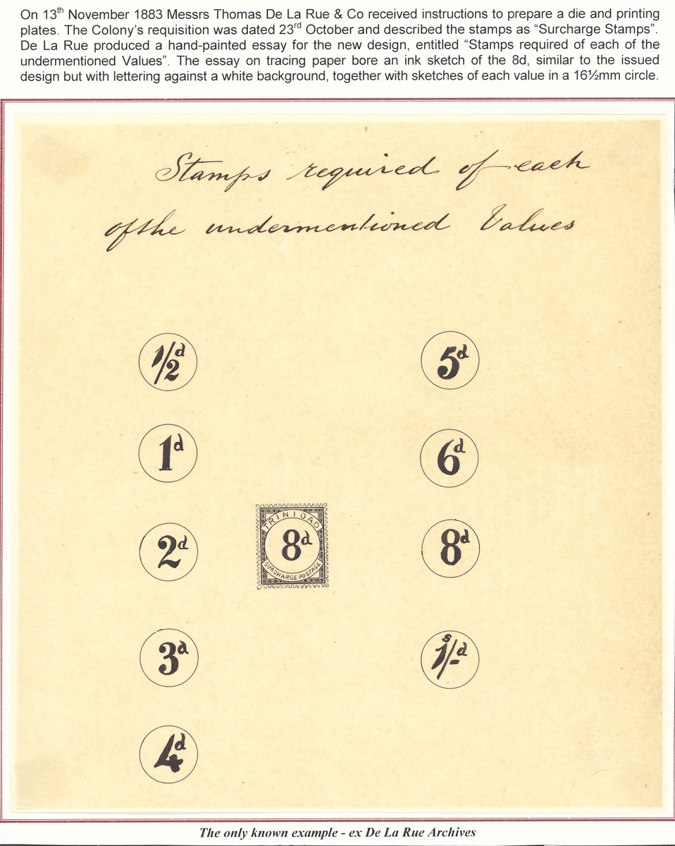 1885 piece of tracing paper (185x200mm.) entitled "Stamps required of each of the undermentioned values", bearing 8d. pen and ink sketch similar to the issued design but with lettering against white background, together with sketches of the ½d., 1d., 2d., 3d., 4d., 5d., 6d., 8d. and 1/- values, each in a 16½mm.  circle.