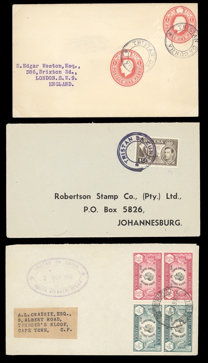 1921 (c.) undated Edgar Weston envelope to London bearing KGV 1d. postal stationery cut-to-shape pair both cancelled by Type III handstamp, 1936 (c.) Robertson Stamp Co. printed envelope to Johannesburg bearing 1952 1/- with Type VII handstamp and 1950 (2 Nov.) envelope to Cape Town showing Type X oval dated cachet and bearing South Africa Silver Jubilee ½d. and 1d. pairs sharing arrival Paquebot datestamp for 13 November