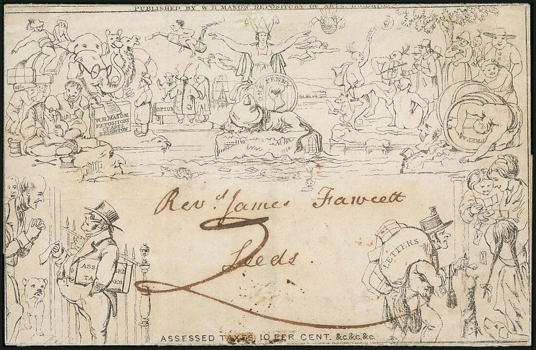 W.H. Mason: Assessed Taxes 10 Per Cent; 1840 (3 Oct.) letter sheet from Hull to Leeds, charged "2" in manuscript; the reverse with dispatch c.d.s.; some minor splits to folds and light soiling, otherwise fine and scarce. R.P.S. Certificate (2022). Photo