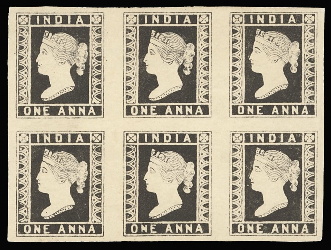 1854 believed to be from a stone of twelve rows of eight, a block of six (3x2) in black on thin yellowish card, fine. Spence 35. Photo