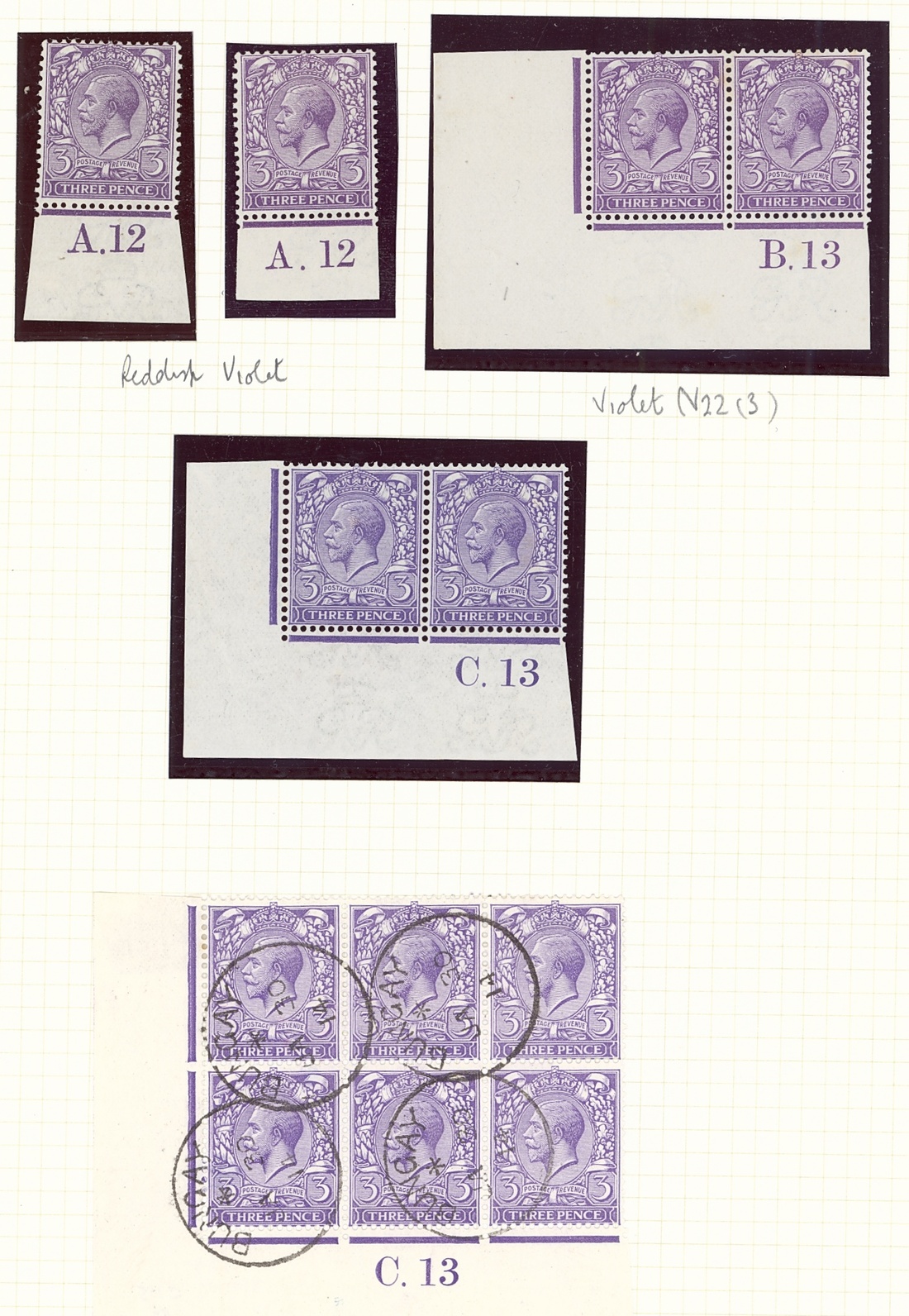 3d. mint (39) and used (13) collection on pages, including shades, control singles, pairs and blocks, etc.; mostly fine. S.G. 374-377 group