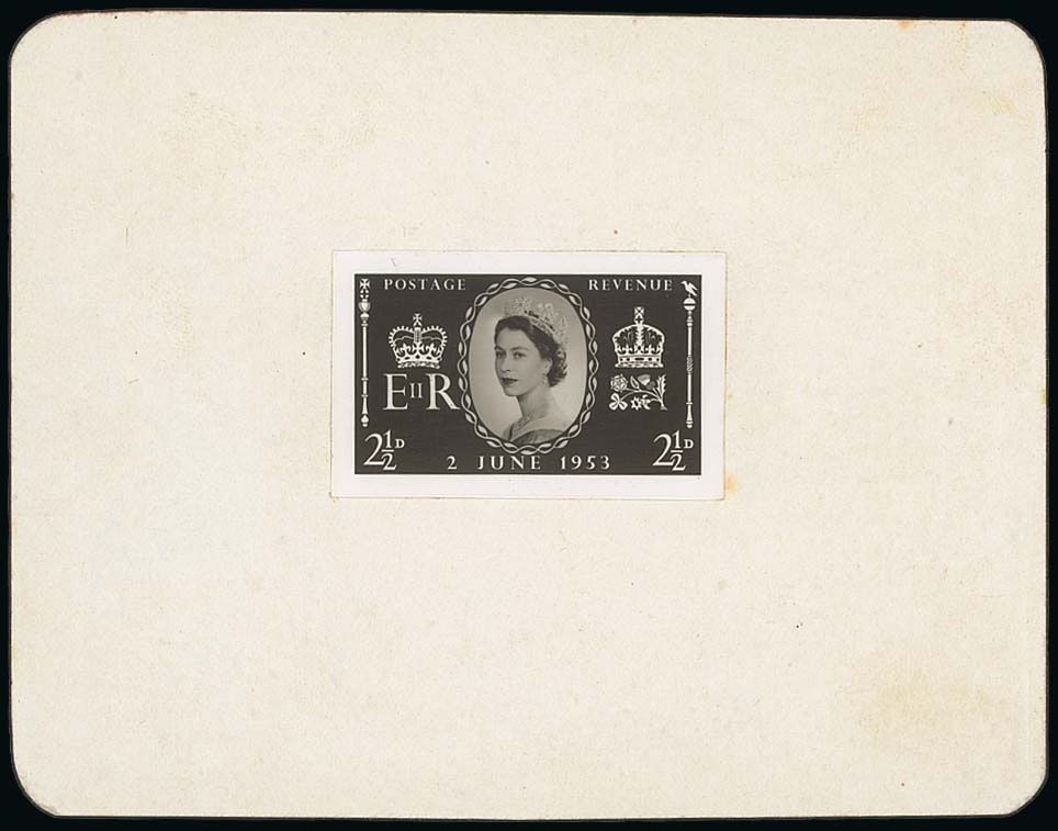 2½d., photographic essay, close to the issued design of the 1/6d. but with smaller head, mounted on card. Also essay of the lettering. Each handstamped "