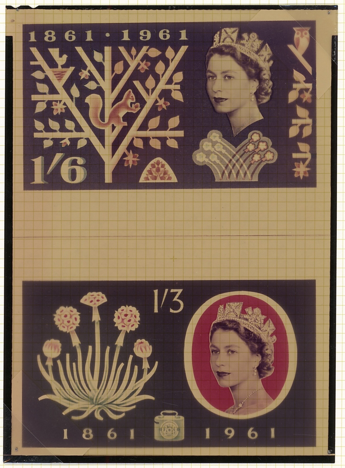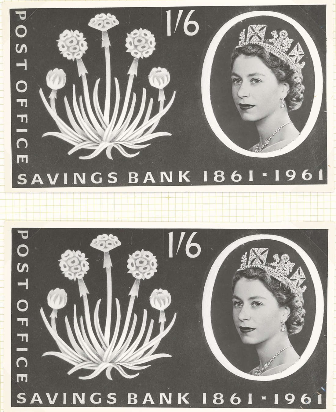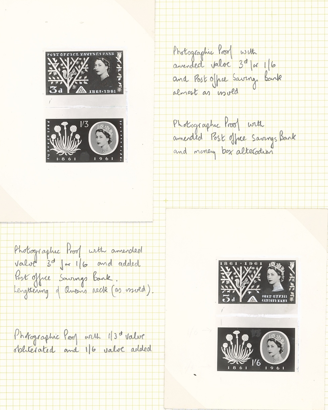 A series of photographic essays on eight pages, including negatives (3, one coloured) inscribed 1/6d. in the design of the issued 3d., inscribed 1/3d. in the design of the issued 1/6d., unadopted types, etc.