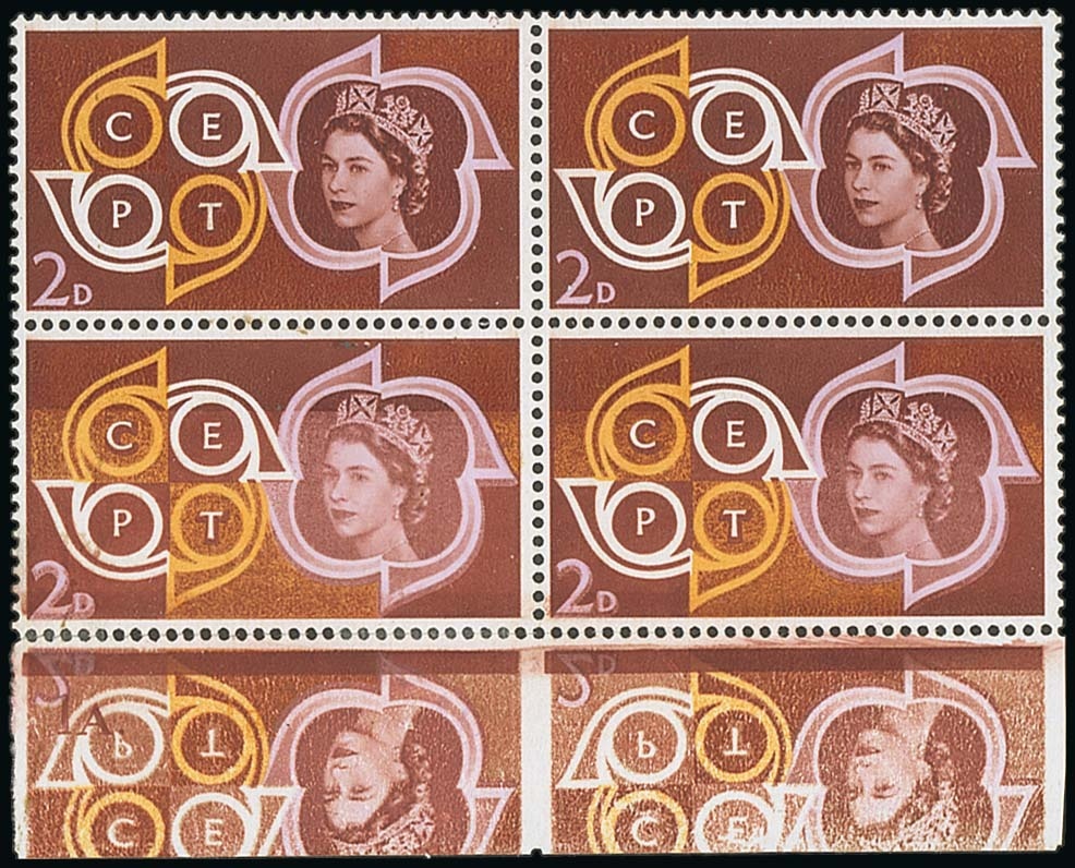 2d. orange, pink and brown, block of four from the foot of the sheet, immediately after printing the margin was folded over resulting in a partial reversed offset impression on the margin; perfs. between the stamps and margins a little strengthened, fine .A rare and outstanding variety. S.G. 626 var. Photo