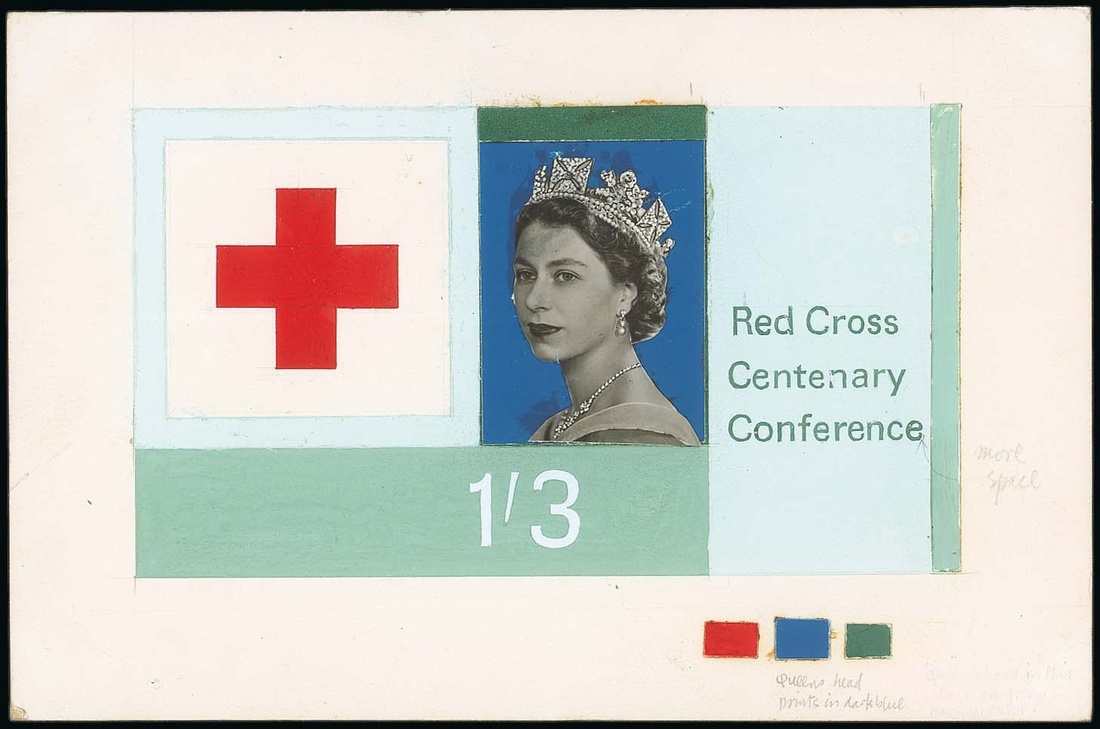 Hand-painted essay (design 155x87mm) of the 1/3d. value on board with a photograph of the Queen's head, fine and with a letter from the artist, Harold Bartram. Photo
