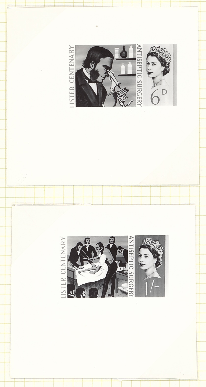 Three pencil sketches on tracing paper for two different unadopted designs (one partly coloured and inscribed "6d."), also photographic proofs of the two designs. Oversize photographic proofs of the issued 4d. and 1/-, all with