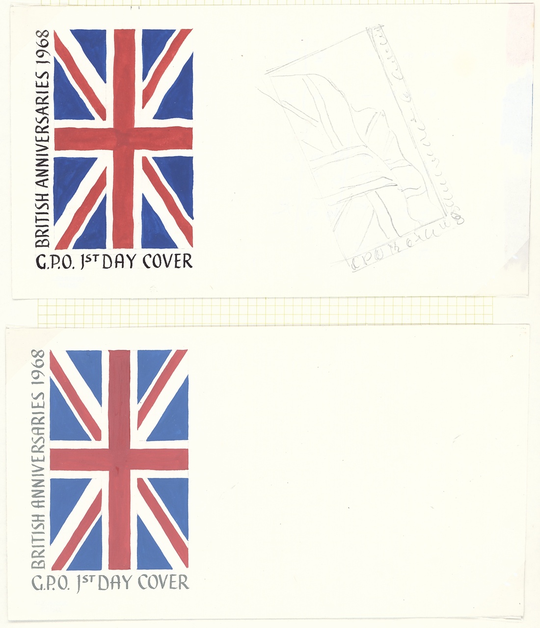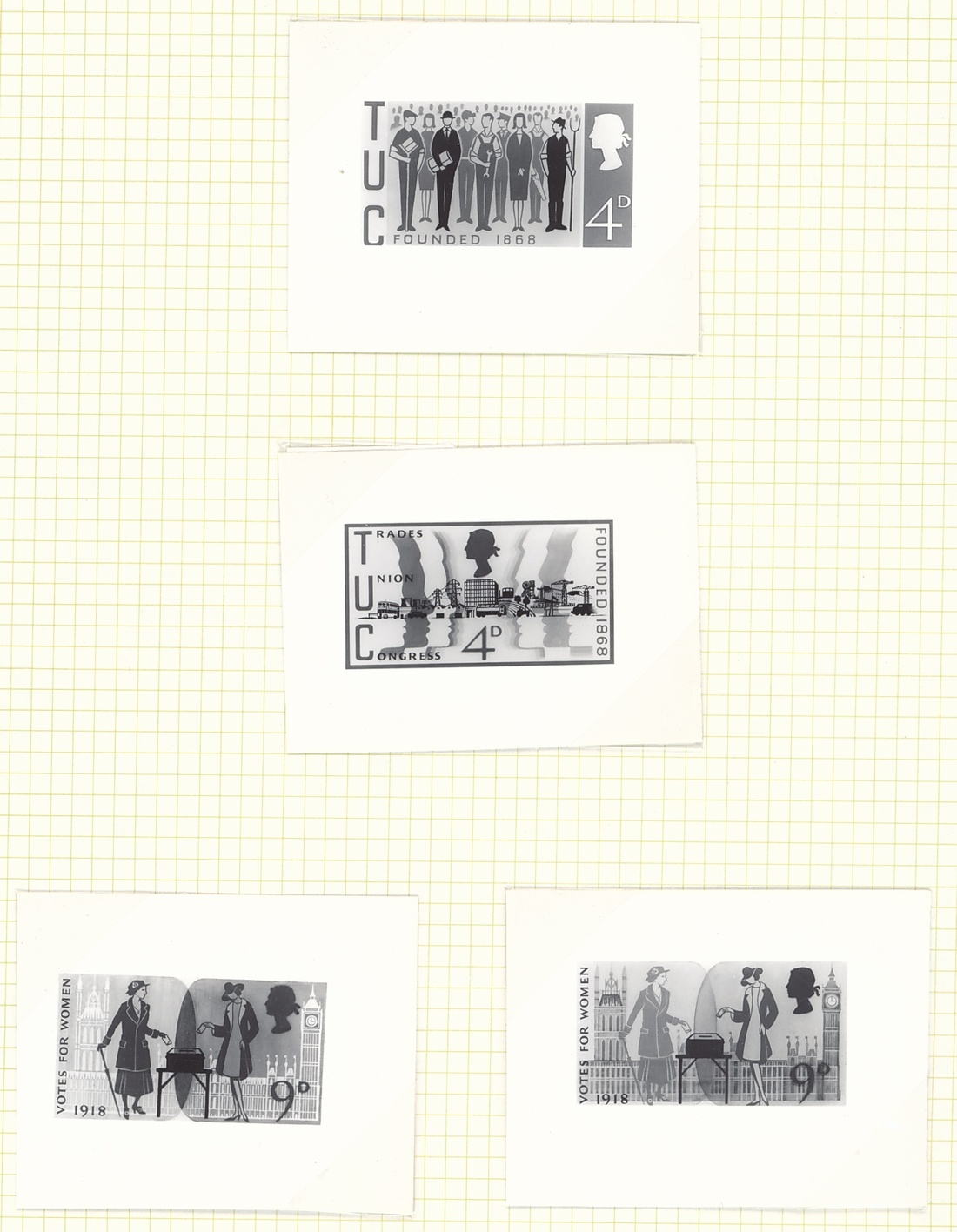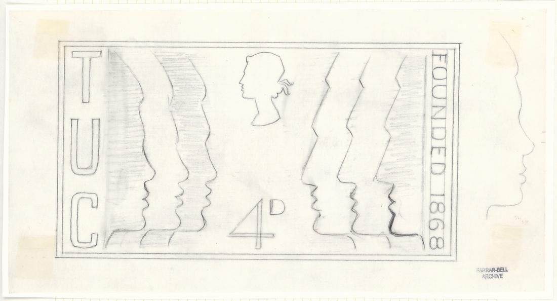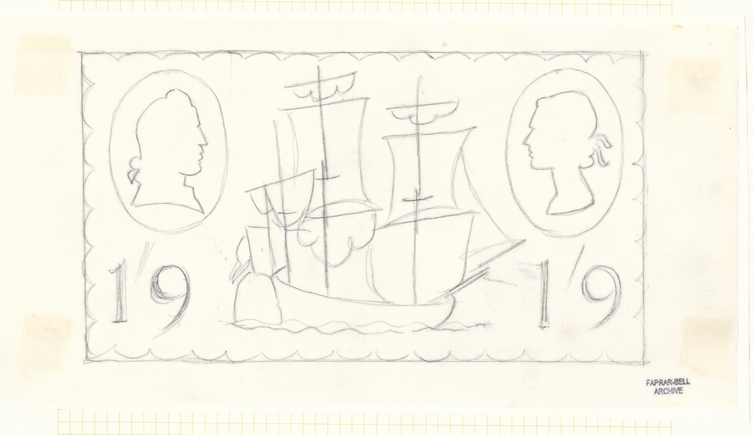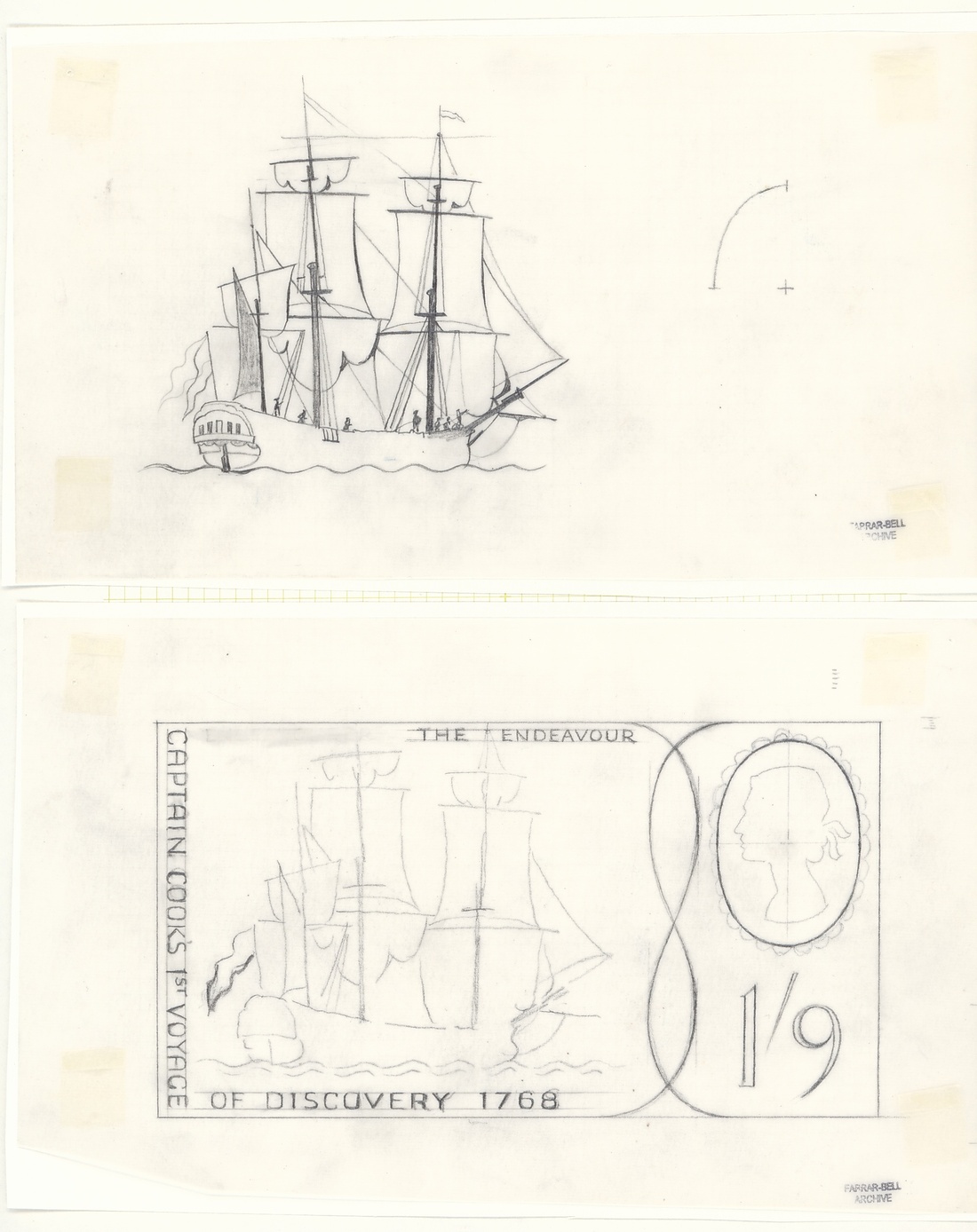 A selection of photographic and pencil essays by Farrar-Bell, including Postal Services Department letter to the artist inviting him to submit essays, photographic essays for 4d. (2), 9d. (2), 1/- (2) and 1/9d. values (all different), pencil sketches on tracing paper with 4d. (3), 1/-, 1/9d. (4), also the first day cover with a pencil sketch and three different hand-painted. All with