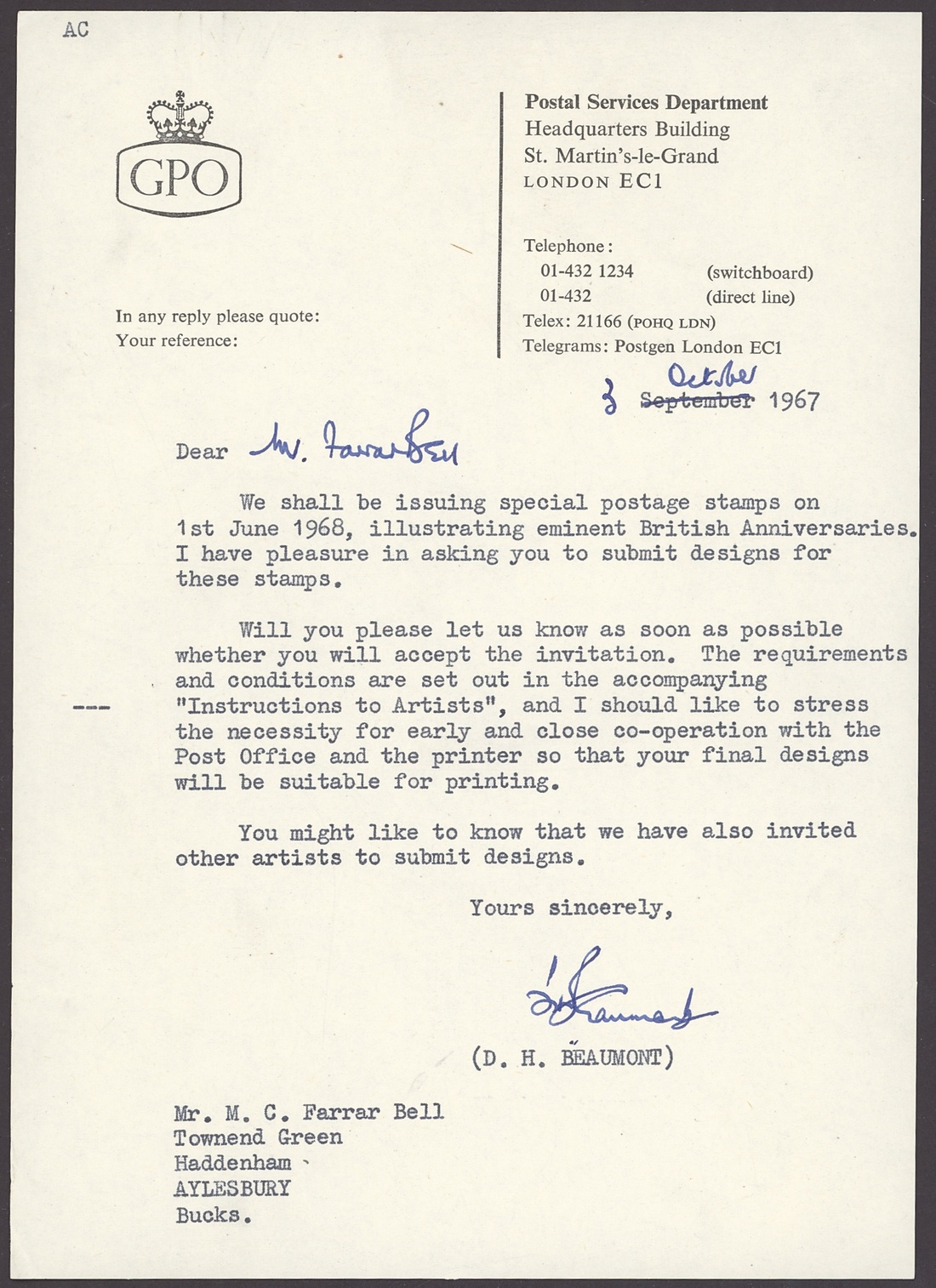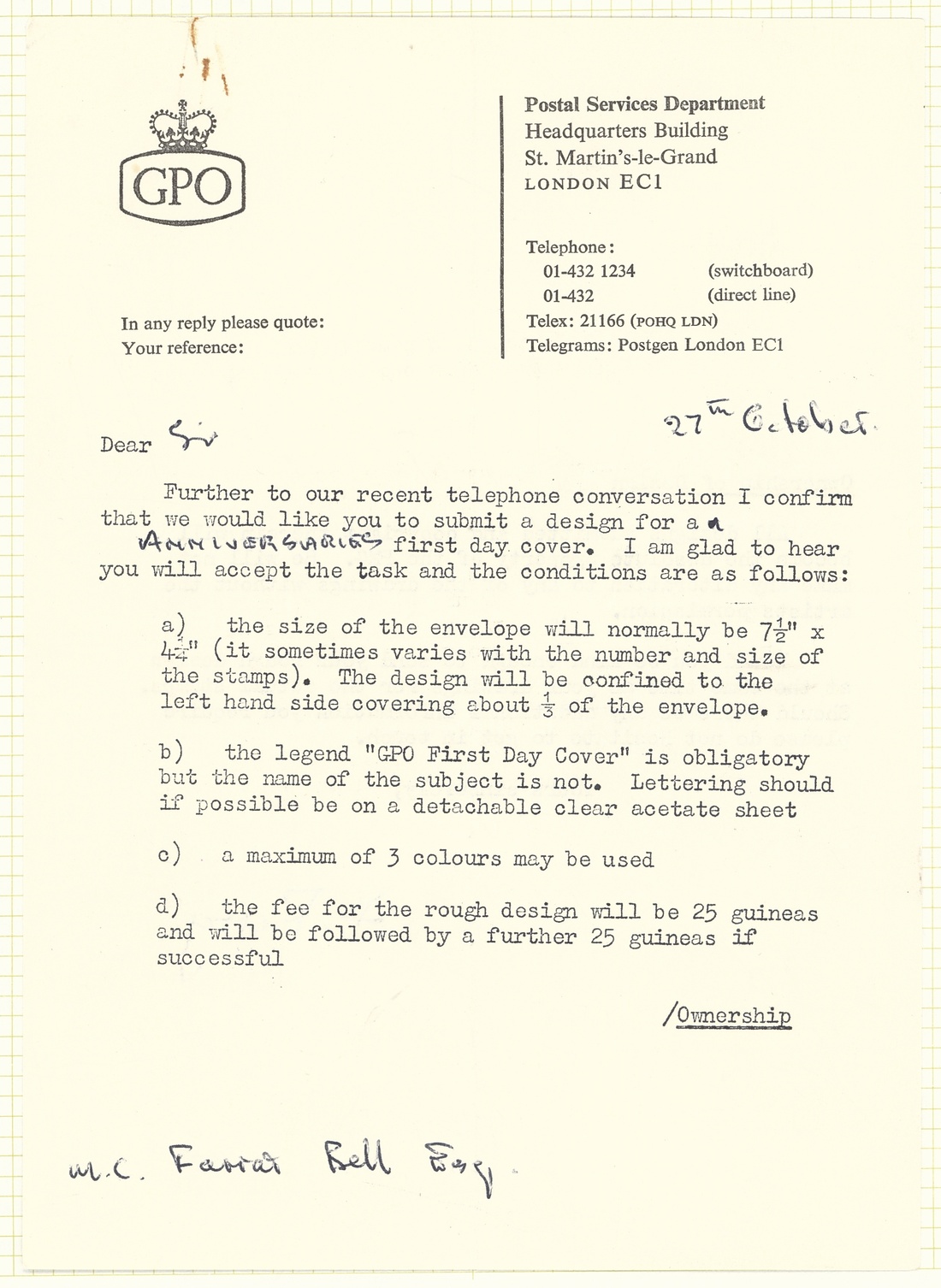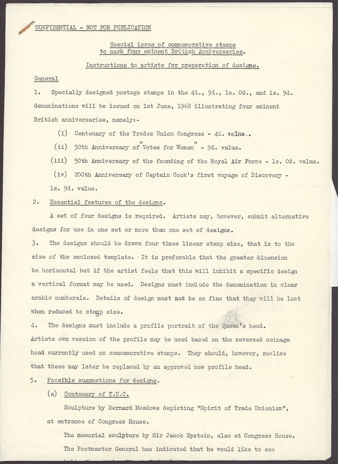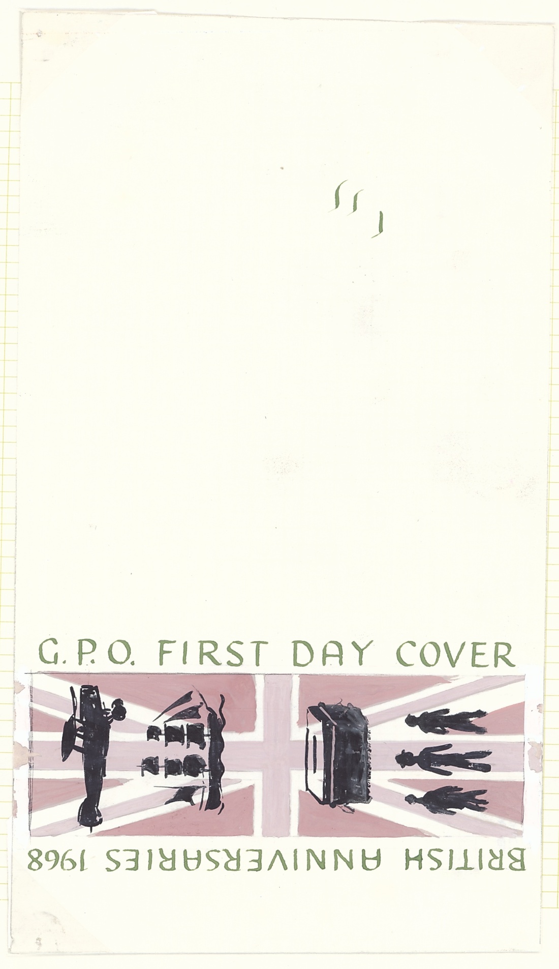 A selection of photographic and pencil essays by Farrar-Bell, including Postal Services Department letter to the artist inviting him to submit essays, photographic essays for 4d. (2), 9d. (2), 1/- (2) and 1/9d. values (all different), pencil sketches on tracing paper with 4d. (3), 1/-, 1/9d. (4), also the first day cover with a pencil sketch and three different hand-painted. All with