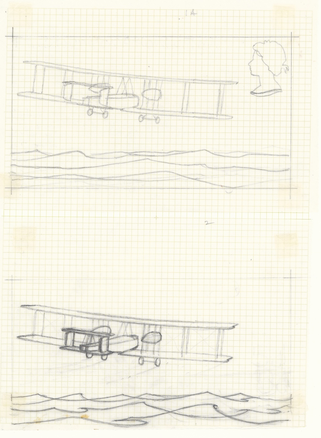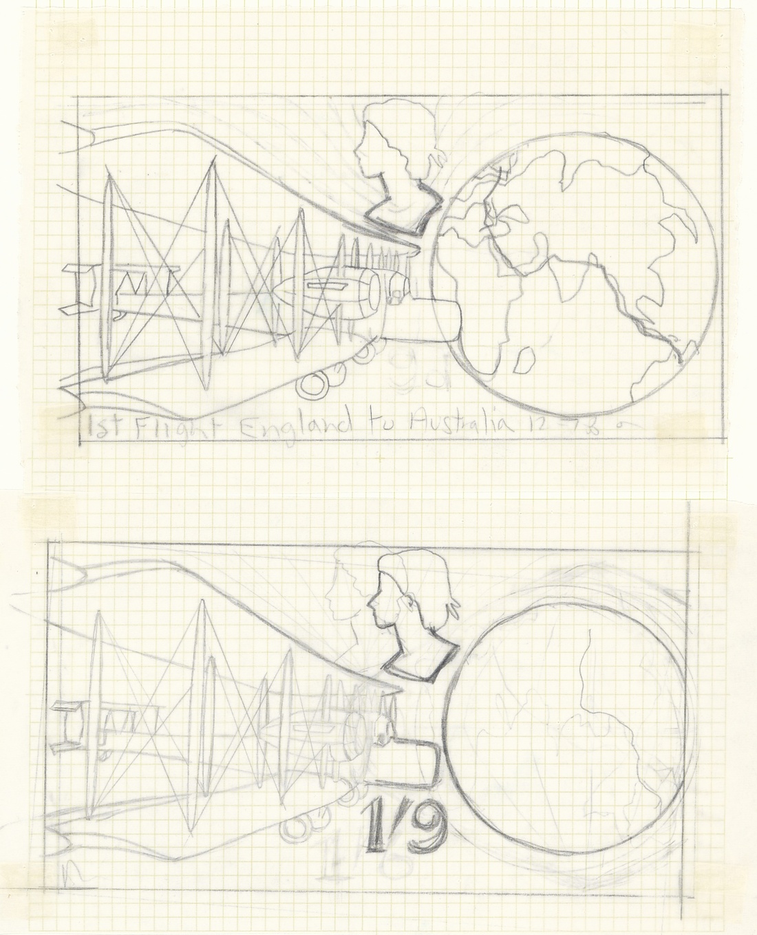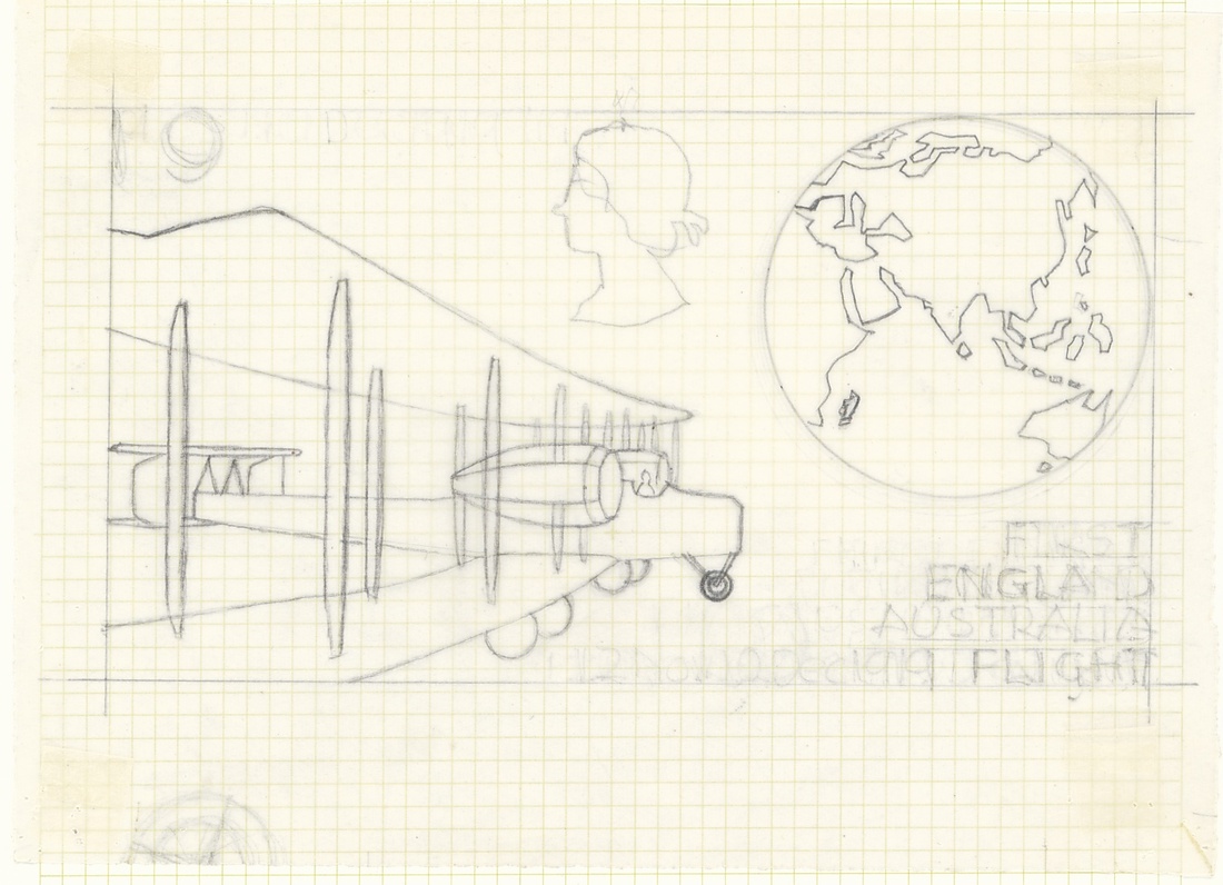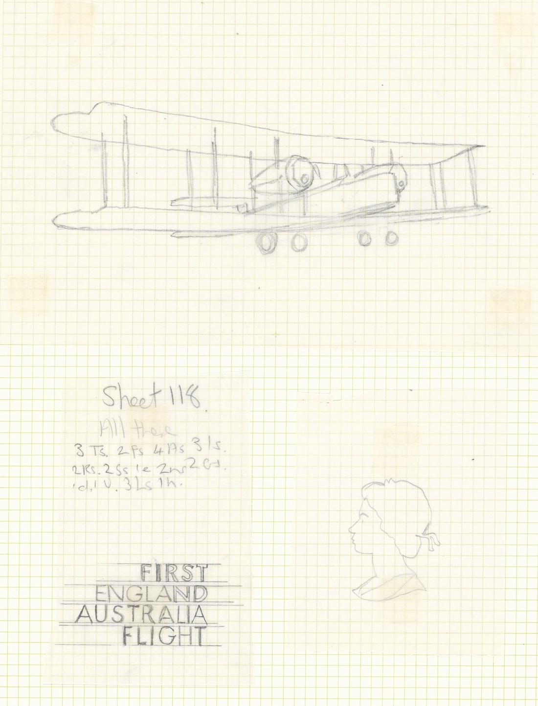 1/9d. Vickers FB-27 Vimy aircraft and globe, a selection of twenty four pencil on tracing paper sketches illustrating the development of the design, also two hand-painted essays depicting the ocean and a draft letter by the artist defending criticism of the route contained in the design