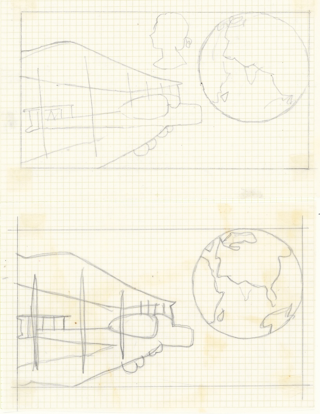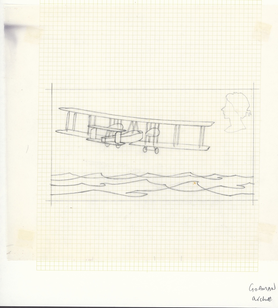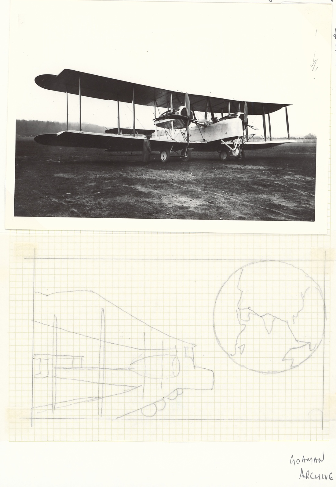 1/9d. Vickers FB-27 Vimy aircraft and globe, a selection of twenty four pencil on tracing paper sketches illustrating the development of the design, also two hand-painted essays depicting the ocean and a draft letter by the artist defending criticism of the route contained in the design
