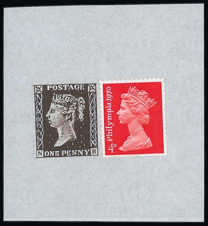 4d. unadopted essay by Andrew Restall, utilising an issued 4d. vermilion Machin with "Philympia 1970" hand-painted in Chinese white at left, alongside a hand-painted Penny Black; fine. Photo
