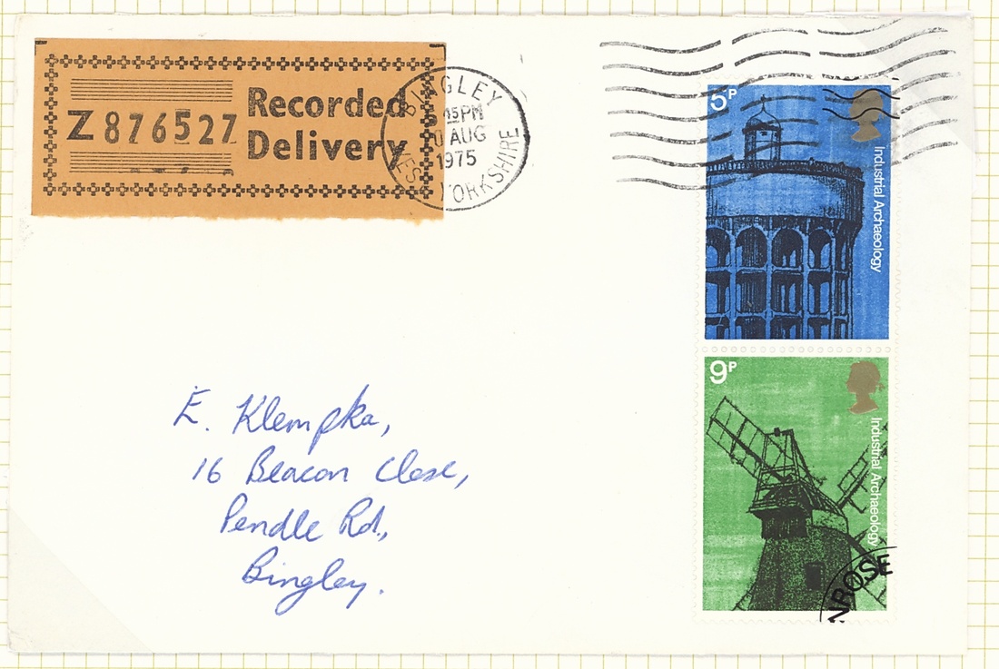 5p. and 9p. unadopted essays, se-tenant pair, on recorded delivery envelope to E. Klempka, the 5p. with Bingley wavy lines cancellation the 9p. with pre-printed Penrose cancellation; unusual