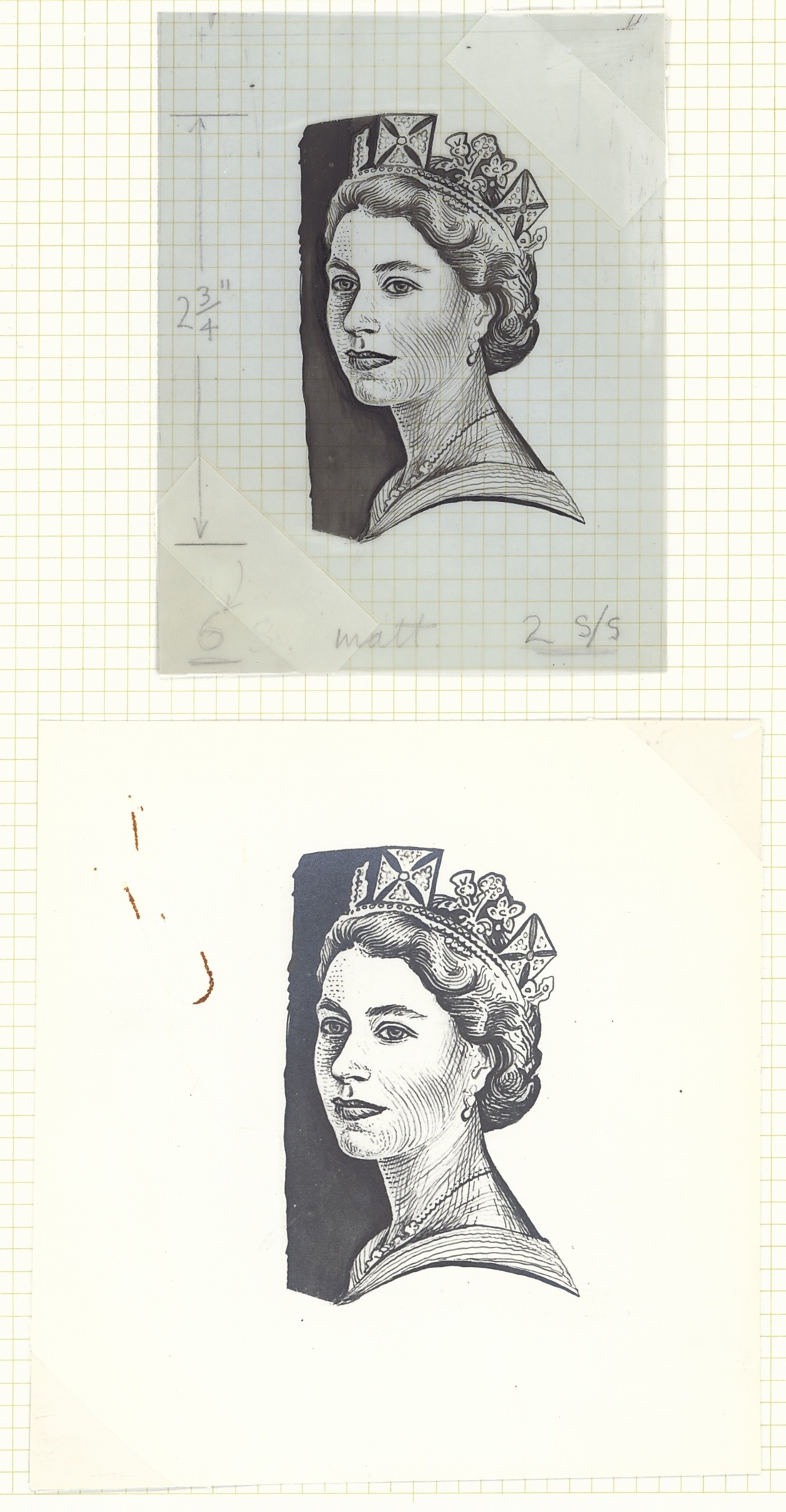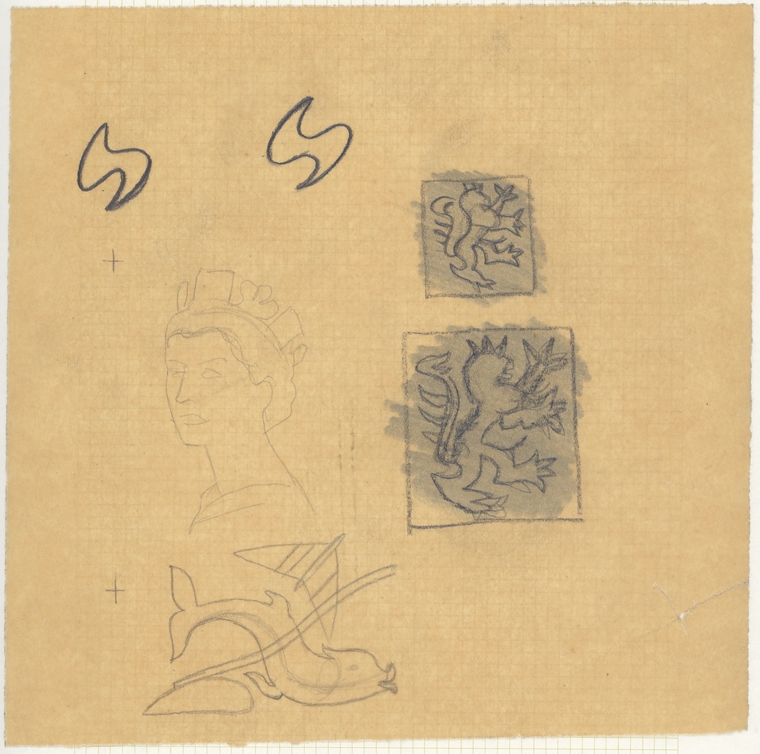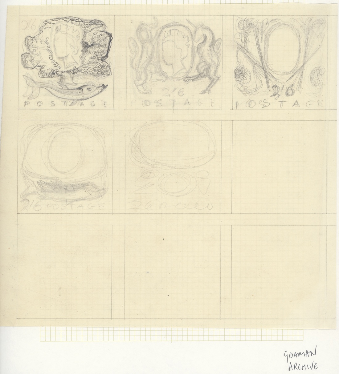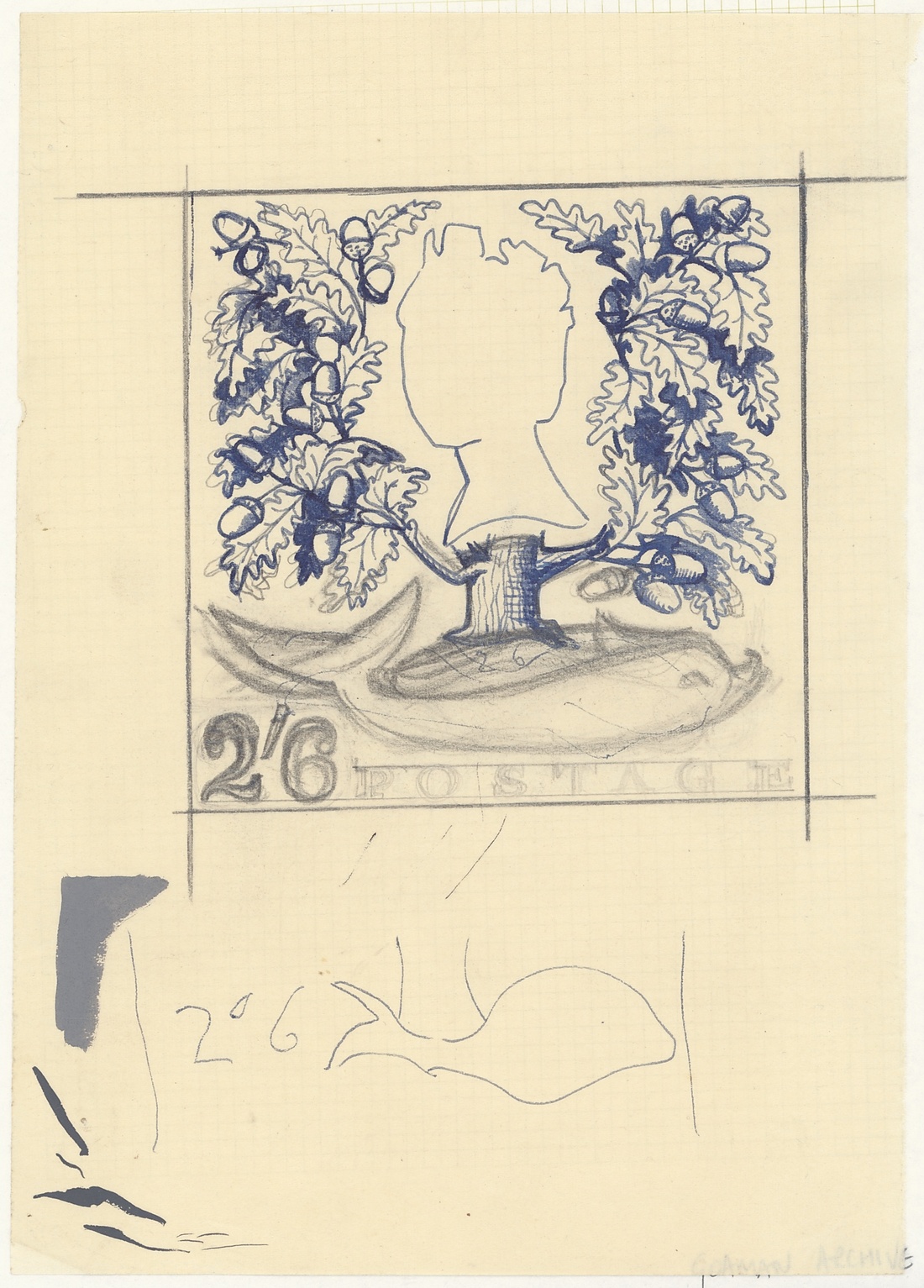 A remarkable selection of sketches and doodles on over twenty pages, also photographic proof of an unadopted 2/6d. design, ink sketch and two printed essays of the same type of the Queen's head. Also two letters to the artist from G.P.O. headquarters and "Instructions to artists for the preparation of designs for postage Stamps". A unique assembly