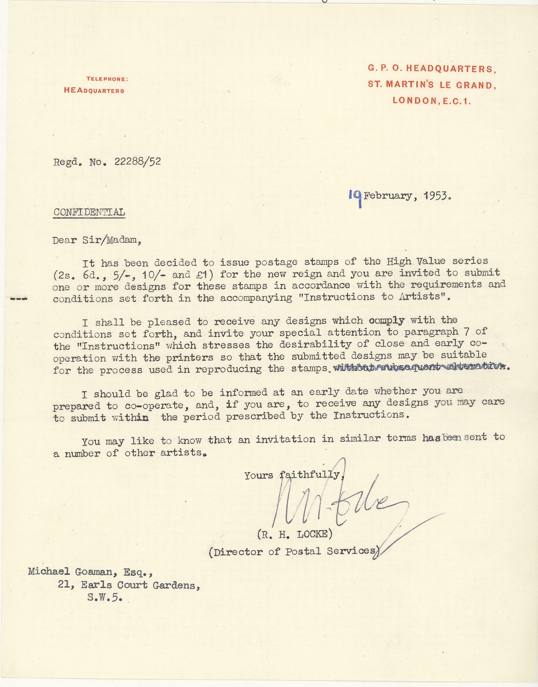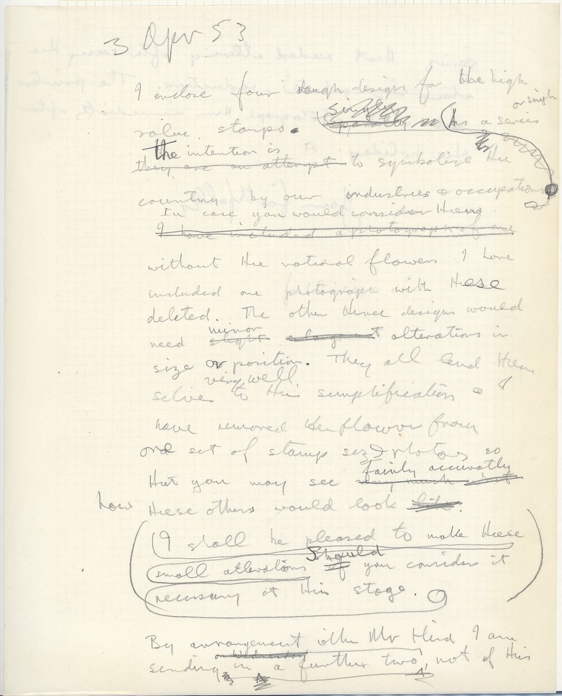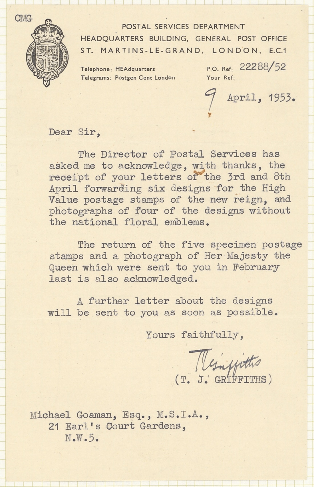 A remarkable selection of sketches and doodles on over twenty pages, also photographic proof of an unadopted 2/6d. design, ink sketch and two printed essays of the same type of the Queen's head. Also two letters to the artist from G.P.O. headquarters and "Instructions to artists for the preparation of designs for postage Stamps". A unique assembly