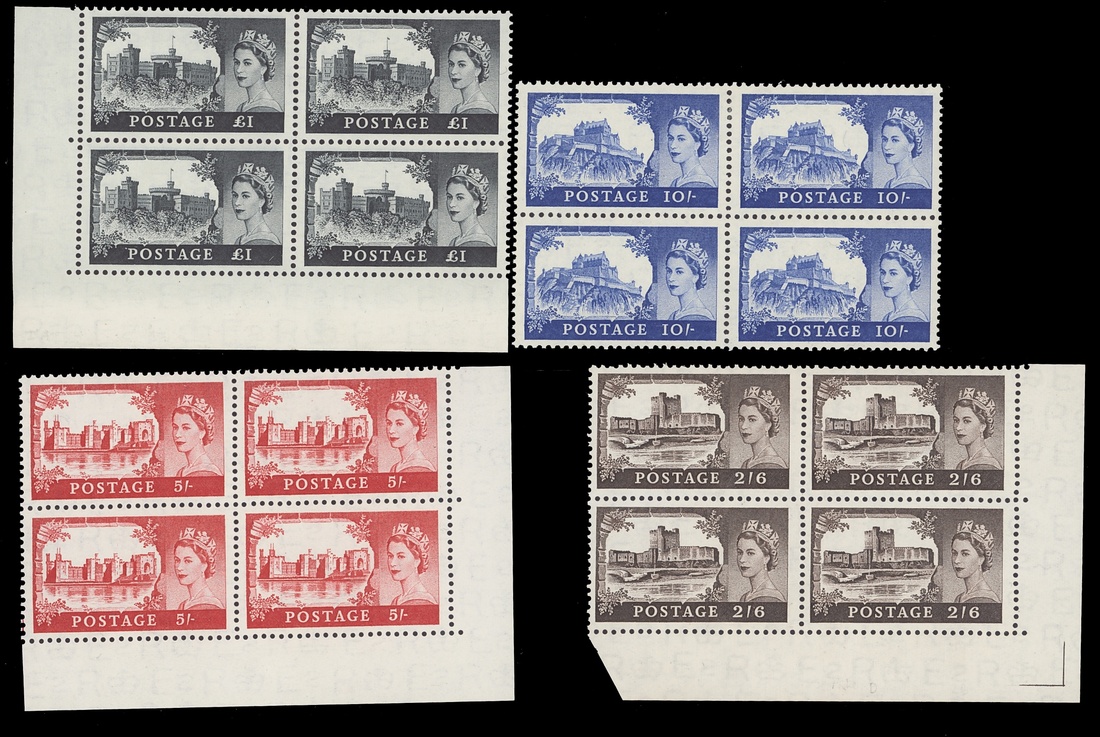 2/6d. to £1, set in blocks of four, unmounted mint (except two 10/- hinged), 2/6d, 5/- and £1 from the corners of the sheets; fine. S.G.533-539, £1,000+