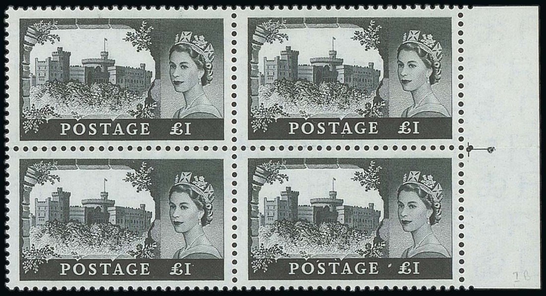 2/6d. to £1, set in unmounted mint blocks of four, each from the right of the sheet and showing perforating guide marks; folded through horizontal perfs., fine. S.G. 536a-539a, £2,400+. Photo