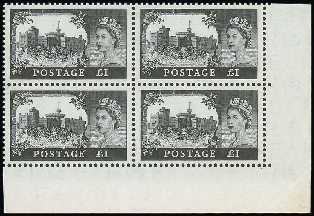 2/6d. to £1, set in unmounted mint blocks of four, the 2/6d., 5/- and £1 from the lower right corners of the sheet; a few minor wrinkles, chiefly in the margins, fine. S.G. 536a-539a, £2,400+. Photo.