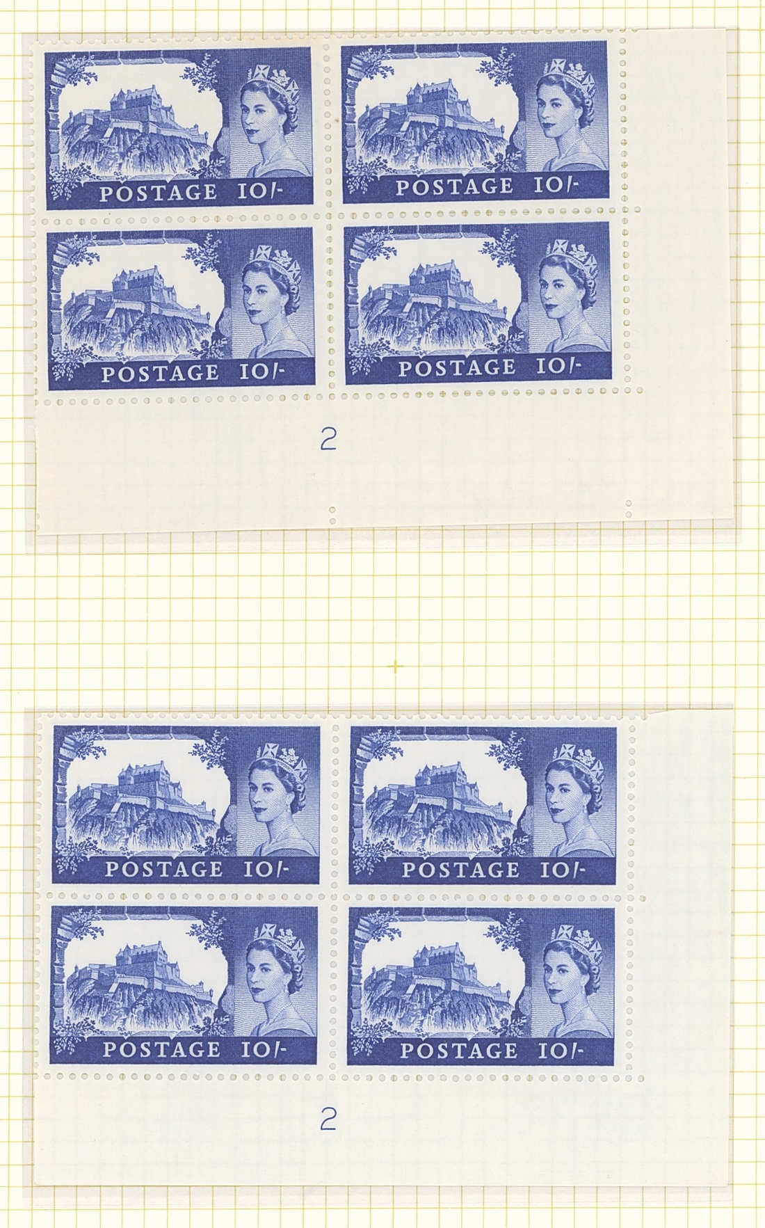 Mint and used collection on pages, including 2/6d. sets of plate number blocks 10-13, 10A-13A, 5/- sets of plate number blocks 4-6, 4A-6A, 10/- plate blocks 2 and 2A, £1 plate blocks 1 and 1A, complete sheet of forty, 2/6d. to £1 overprinted