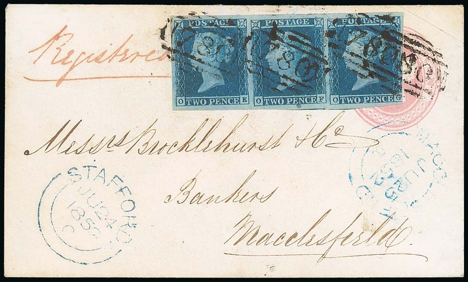1852 (24 June) Brocklehurst Penny Pink envelope to Macclesfield uprated with 2d. blue, plate 4, OE-OG strip of three (good to enormous margins, just cut into lower right corner) well tied by "780" numerals of Tavistock, with Stafford and Macclesfield (25.6) c.d.s. in blue on the address side along with "Registered" in red ink, a further arrival c.d.s. on the reverse. Fine. Photo