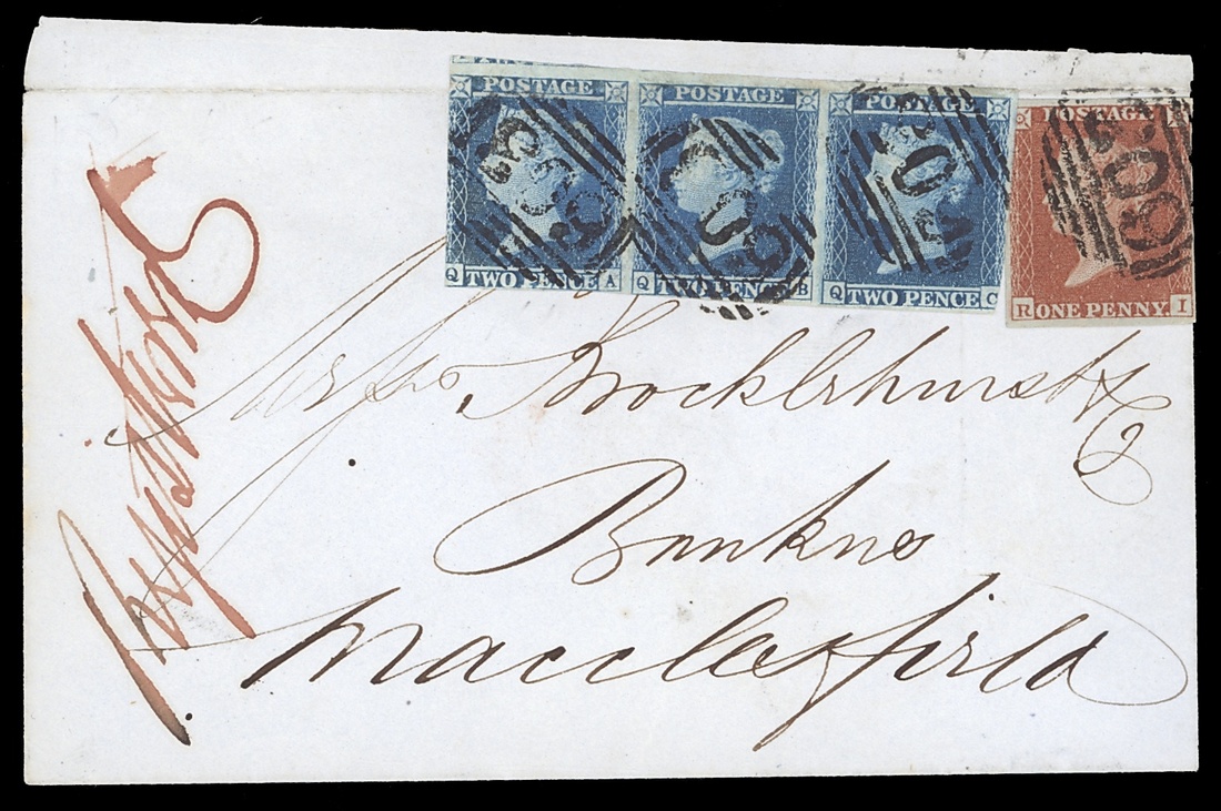 1853 (14 Sept.) Brocklehurst envelope to Macclesfield bearing 1841 1d. red-brown, RI (small to good margins) and 1841 2d. blue, plate 4, QA-QC strip of three (mixed margins) tied by "603" numerals with bold "Registered" in red ink at left, the reverse with Oxford (red) and Macclesfield (bluish) c.d.s.; the adhesives were affixed over the top of the envelope and are creased there
