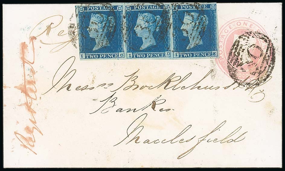 1853 (28 Dec.) Brocklehurst Penny Pink envelope to Macclesfield, uprated with 1841 2d. blue, plate 4, IC-IE (margins generally large, touching lower left corner) tied by "30" numerals with "Registered" in red ink at left, the reverse with Ashby-de-la-Zouch (green) and Macclesfield (bluish) c.d.s. Attractive. Photo
