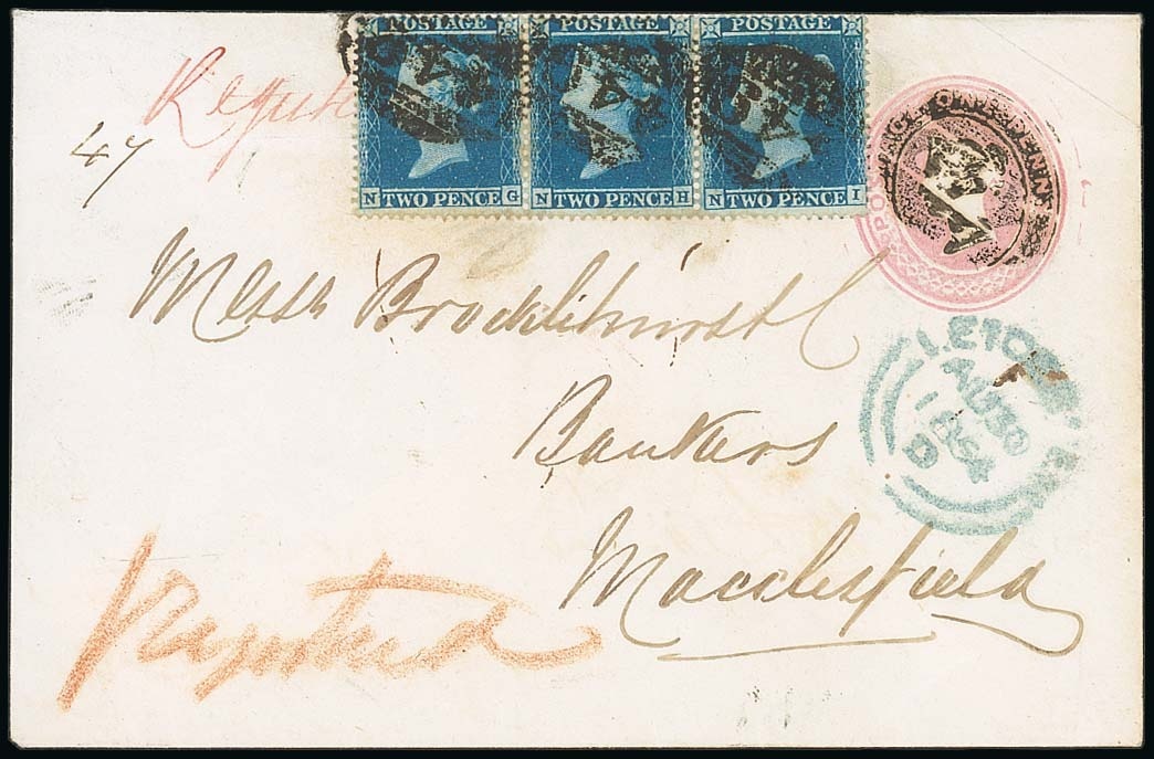 1854 (30 Aug.) Brocklehurst large Penny Pink envelope to Macclesfield uprated with perforated 2d. blue, plate 4, NG-NI strip of three cancelled by "492 numerals with Leicester despatch c.d.s. in blue alongside, "Registered" in magenta ink and in orange crayon, the reverse with Macclesfield arrival. Photo