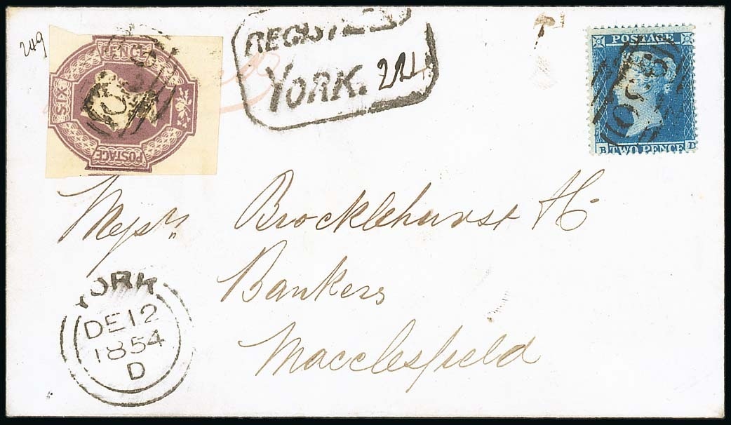 1854 (12 Dec.) Brocklehurst envelope to Macclesfield bearing Embossed 6d. dull lilac (touching at right, other margins close to large) with 2d. Stars cancelled by "930" numerals with a fine strike of the York boxed registered handstamp and despatch c.d.s., Macclesfield arrival on the reverse (13.12). An attractive cover. Plate