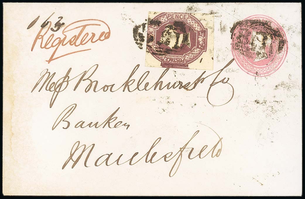 1855 (27 Jan.) Brocklehurst Penny Pink envelope to Macclesfield with 1847-54 6d, mauve (cut into top and right and creased) tied by indistinct "831" with manuscript "Registered" alongside in red ink with the registration number, the reverse with Wakefield despatch ad arrival c.d.s. Photo