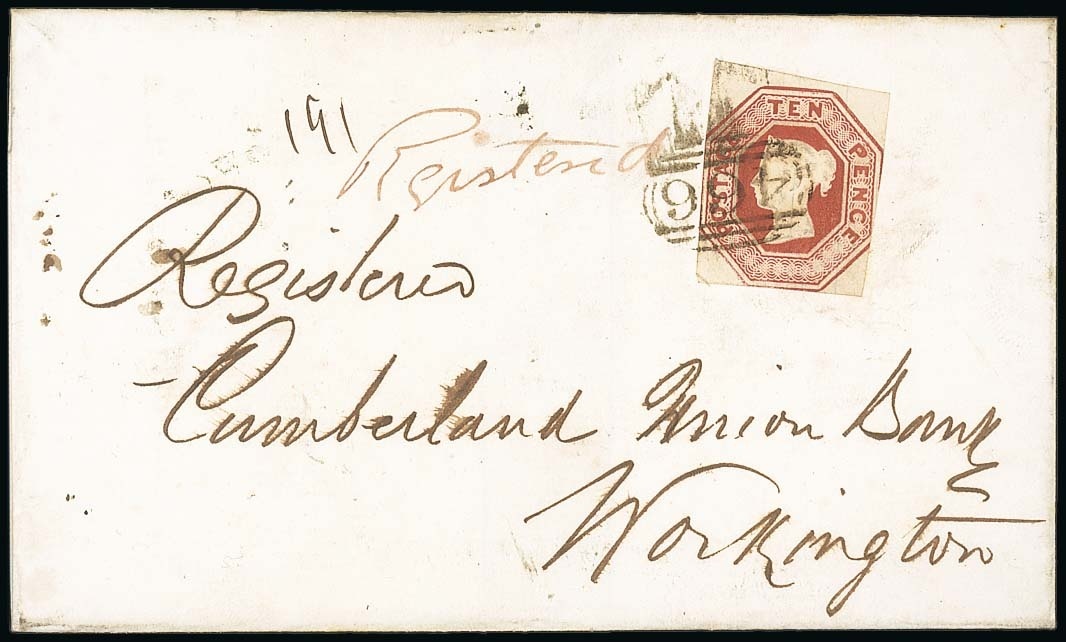 1855 (16 Apr.) commercial wrapper to Workington with manuscript "Registered" in red ink, bearing Embossed 10d. brown, die 3 (touching or cut into on three sides) tied by a neat strike of "466" numeral, the reverse with Liverpool despatch and Workington arrival c.d.s. Light vertical filing crease, an attractive cover. Photo