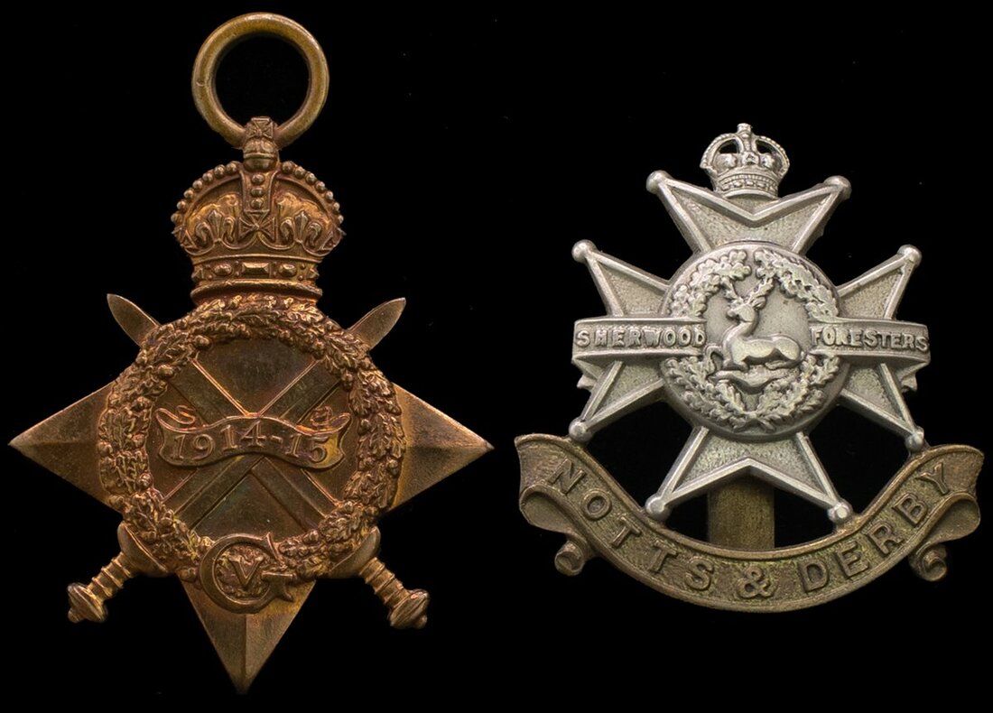 John William Stapleton joined the war in France on 27 October 1915 with the rank of Private and served until 8 April 1919 when he was discharged with the rank of Sergeant; sold together with a Sherwood Foresters cap badge.