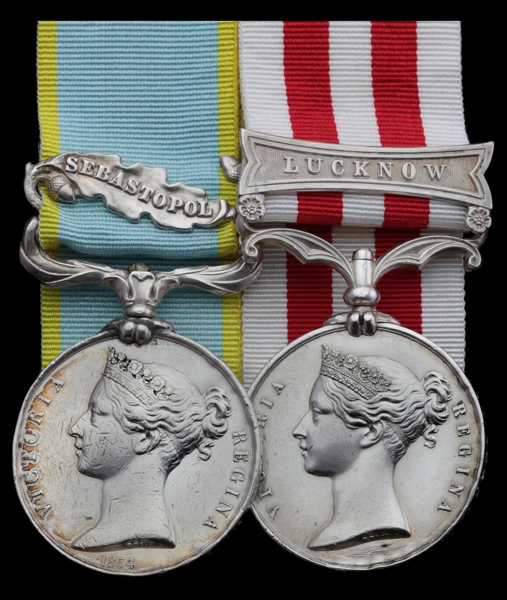 Crimea 1854-56, 1 clasp, Sebastopol (No 4434 C. Hulland I 23rd R.W.F.); Indian Mutiny 1857-59, 1 clasp, Lucknow (N.o. 4434 Serjt. C. Hulland 1st. 23rd R.W.F.), both with unofficial re-impressed naming, nearly very fine (2)