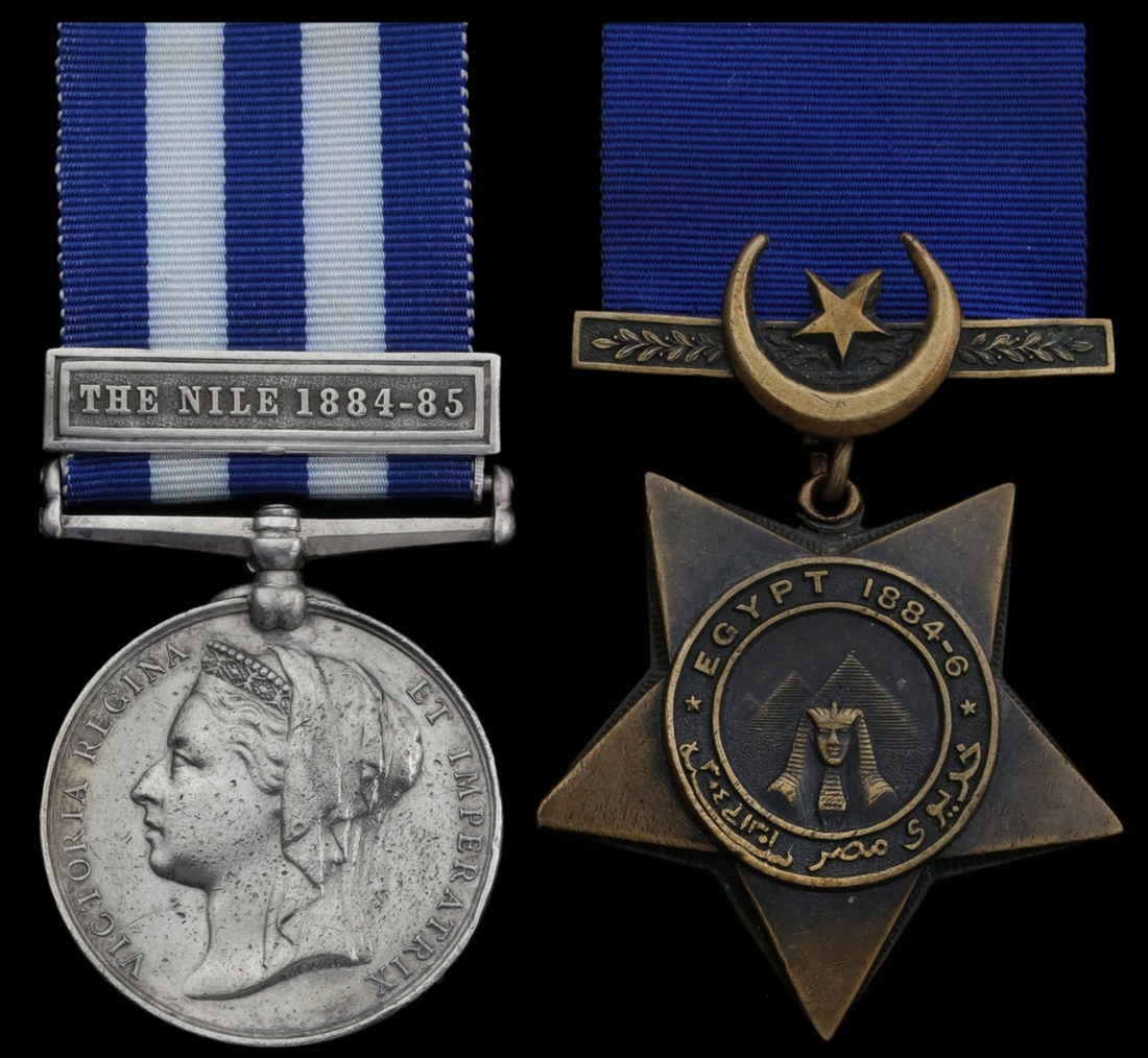Egypt and Sudan 1882-89, undated reverse, 1 clasp, The Nile 1884-85 (626. Corp: J. Donnolly. 1/Rl. Ir: Regt.); Khedive's Star 1884-6, the reverse impressed '626 RI', pitting from Star, nearly very fine (2)