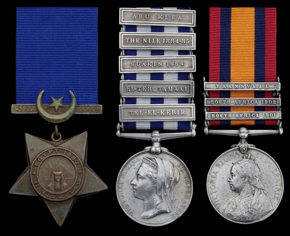 Egypt and Sudan 1882-89, 5 clasps, Tel-el-Kebir, El-Teb_Tamaai, Suakin 1884, The Nile 1884-85, Abu Klea (Sergt A. C. Marsters. 19th Hussars), renamed and fitted with copy clasps; Queens South Africa 1899-1902, 3 clasps, South Africa 1901, South Africa 1902, Transvaal (5445 Serjt: A. C. Marsters. 13th Hussars.); Khedive's Star, 1882, unnamed as issued, heavy contact wear overall, the second renamed and fitted with copy clasps, overall good fine (3)