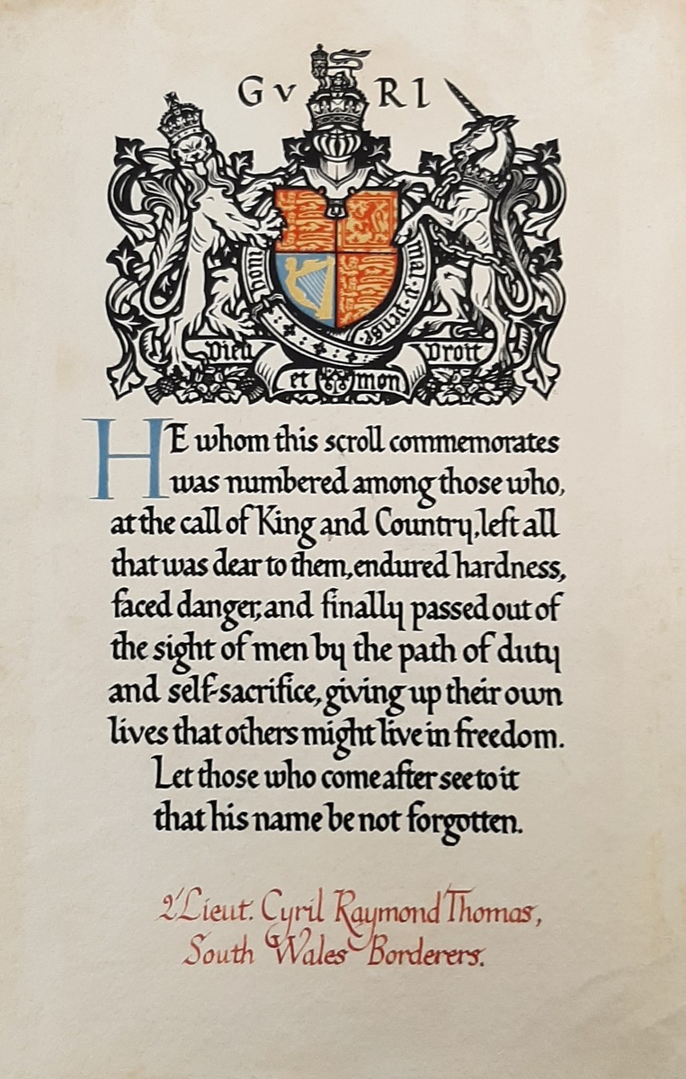 Despite this Thomas' body was eventually located and identified, with the Field Service report noting that he was killed in action in the field. He is buried at the Doiran Military Cemetery; sold together with original memorial scroll and copied research including census data, service papers and an application for Commission along with M.I.C., an extract from the Western Mail and Commonwealth War Graves details.