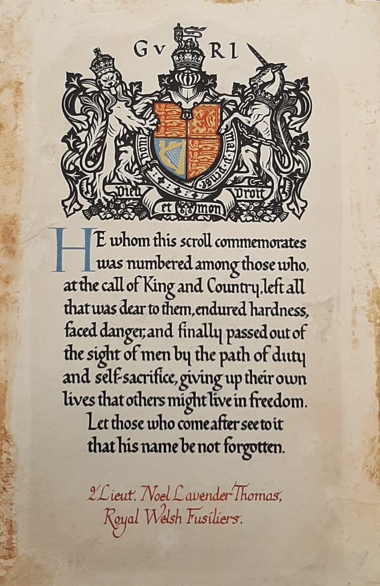 Noel Lavender Thomas was born at Newport, Monmouthshire on 10 December 1895, the son of Octavius and Pheobe Thomas. The eldest of his siblings, Thomas was born before the families spell in Spain and as such was educated in Wales at the Howard Gardens School, Cardiff. Enlisting with the Royal Welsh Fusiliers on 9 October 1914 at Cardiff with the service number 16252, Thomas was promoted Corporal on 1 March 1915 only to revert back to Private at his own request on 7 August.