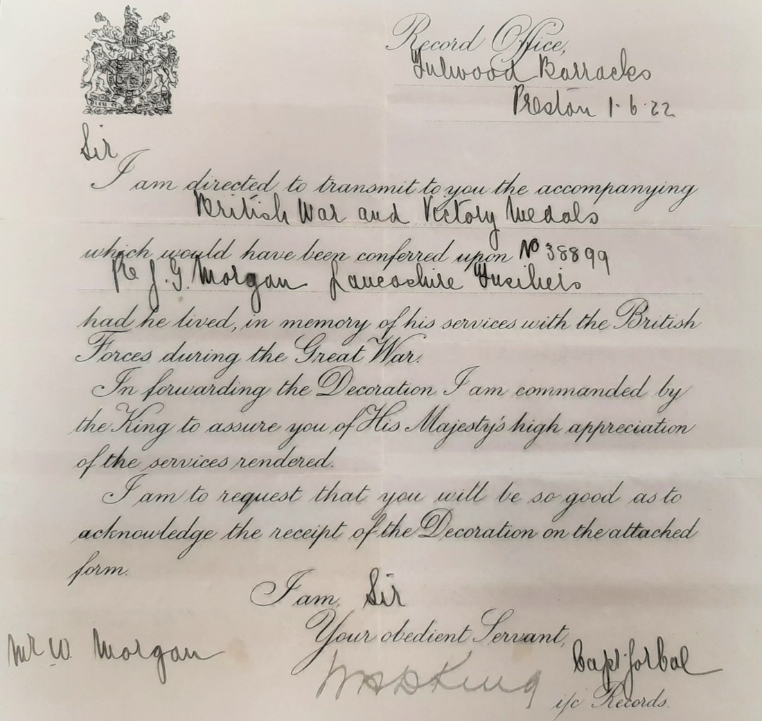 Pair: Private J. G. Morgan, 2nd/7th Lancashire Fusiliers, who was killed in action at Passchendaele on 17 November 1917