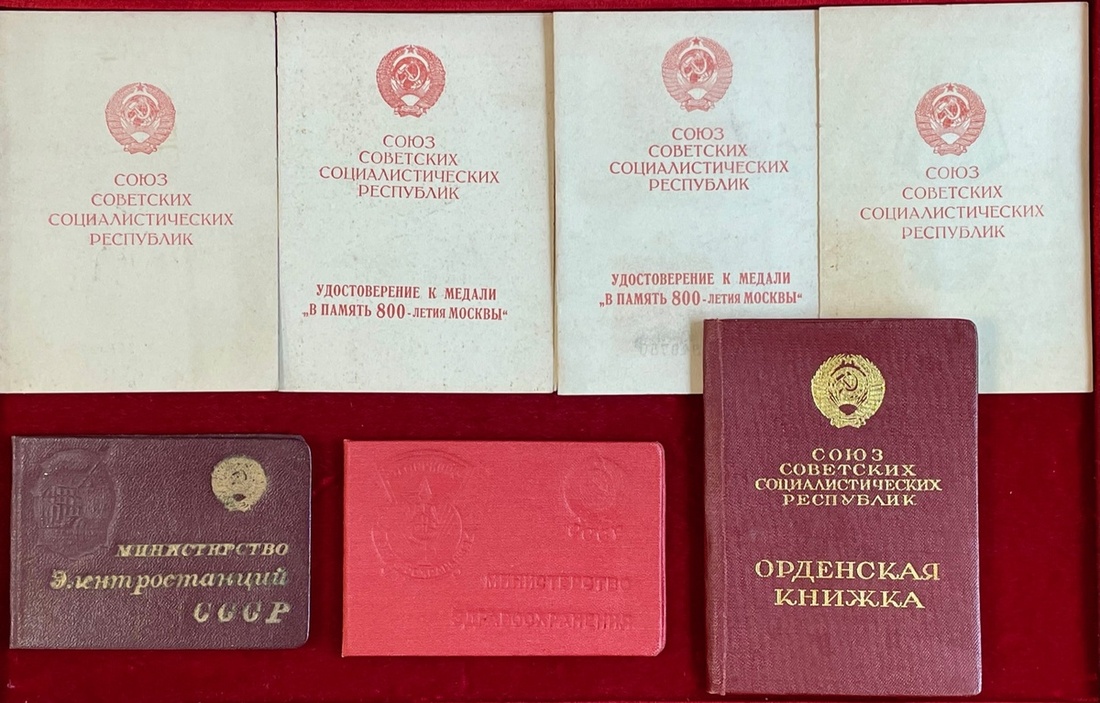Awarded to Evdokia Ivanovna Sokolova, (whose Order of Lenin was presented in 1951), each award is accompanied by its complete supporting document or booklet, the relevant parts filled-in in ink and ink-stamped where relevant, one booklet including a photograph of the recipient. All awards additionally contained in card cases of issue (including two small riband bars) with the Order of Lenin in its' original red card case and the recipient's name included on a torn paper slip.