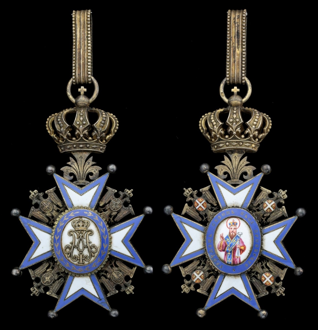 Serbia, Kingdom, Order of St Sava, Commander's neck Badge, Bishop with Red Robes, 83mm including crown suspension x 50mm, silver-gilt and enamel, one or two balls bent, very fine