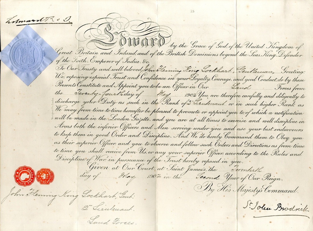 John Fleming King Lockhart was born at Hexham, Northumberland on 27 November 1881, the son of Anne and Colonel Lewis Lockhart of Sonniside Rigg, Hexham. Commissioned Second-Lieutenant in the Royal Horse Artillery on 20 May 1902, he was promoted Lieutenant by 1911. Entering the war in France with the rank of Captain in August 1915, he was further advanced Major and joined the Territorials before 1919, being awarded the D.S.O. whilst serving with them. He died on 1 July 1953; sold together with original documentation including four named and addressed Field Service Postcards, a group photo including the recipient and his original Commission document.