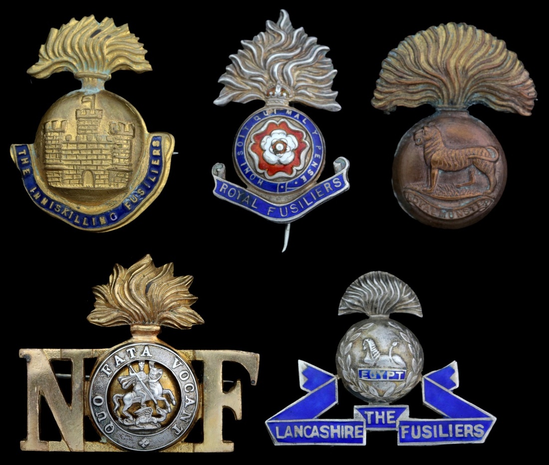 Royal Fusiliers, silver and enamel, reverse marked 'Sterling Silver', 34mm; Royal Munster Fusiliers, gilded base metal, 33mm; Royal Inniskilling Fusiliers, gilded base metal and enamel, 35mm; Lancashire Fusiliers, silver and enamel, reverse marked 'Sterling Silver', 28mm; Northumberland Fusiliers, gilded and white base metal, 32mm, good very fine (5)