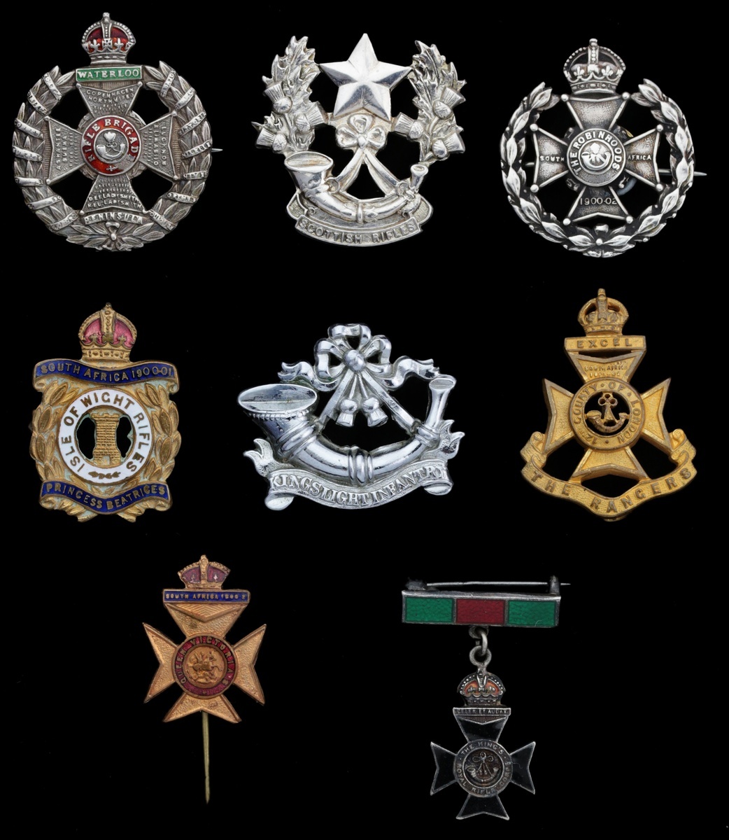 Rifle Brigade, silver and enamel, reverse marked 'Sterling', some enamel damage to centre, 34mm; The Robin Hood Rifles, silver, reverse marked 'Sterling', 32mm; King's Light Infantry, silver-coloured base metal, 27mm; Scottish Rifles, silver, reverse marked 'Sterling Silver', 30mm; Isle of Wight Rifles (Princess Beatrice's), gilded base metal and enamel, 30mm; The Rangers, gilded base metal, 34mm; Queen Victoria's Rifles, gilded base metal and enamel, stick-pin style, 25mm; The King's Royal Rifle Corps, silver and enamel, reverse marked 'Sterling', badge suspended below green-red-green suspension bar, 34mm, generally good very fine (8)