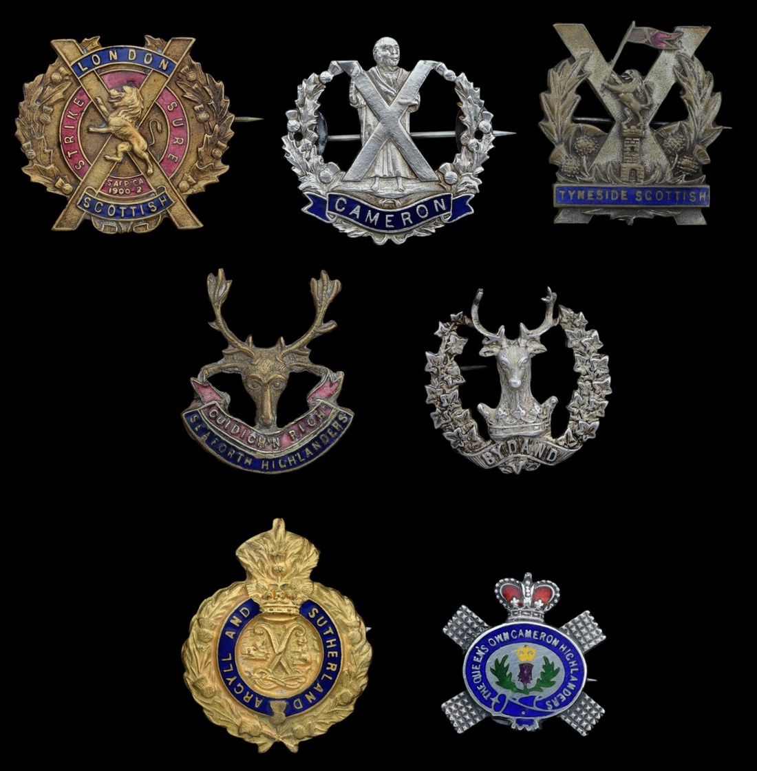 Gordon Highlanders, silver-coloured metal, unmarked, 22mm; Cameron Highlanders, silvered base metal and enamel, 30mm; Tyneside Scottish, silvered base metal and enamel, 30mm; Queen's Own Cameron Highlanders, silver and enamel, hallmarks for Birmingham 1914, 23mm; Argyll and Sutherland Highlanders, gilded base metal and enamel, 32mm; Seaforth Highlanders, gilded base metal and enamel, 28mm; London Scottish, brass and enamel, 29mm, good very fine (7)