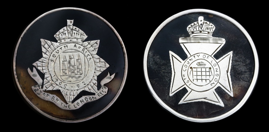 16th County of London (Queen's Westminsters), tortoiseshell effect and silver, hallmarks for London 1915, 22mm diameter; 23rd Battalion The London Regiment, tortoiseshell effect and silver, hallmarks for London 1916, 22mm diameter, pin re-affixed, good very fine (2)