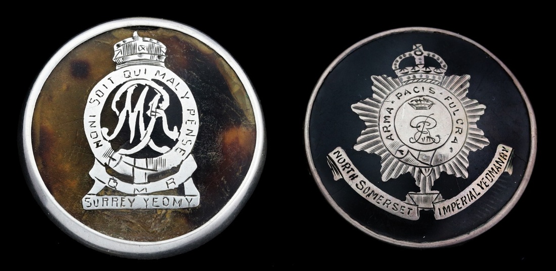 Surrey Yeomanry, tortoiseshell effect and silver, hallmarks for London 1915, 22mm diameter; North Somerset Imperial Yeomanry, tortoiseshell effect and silver, hallmarks for Birmingham 1916, 21mm diameter, pin replaced, good very fine (2)
