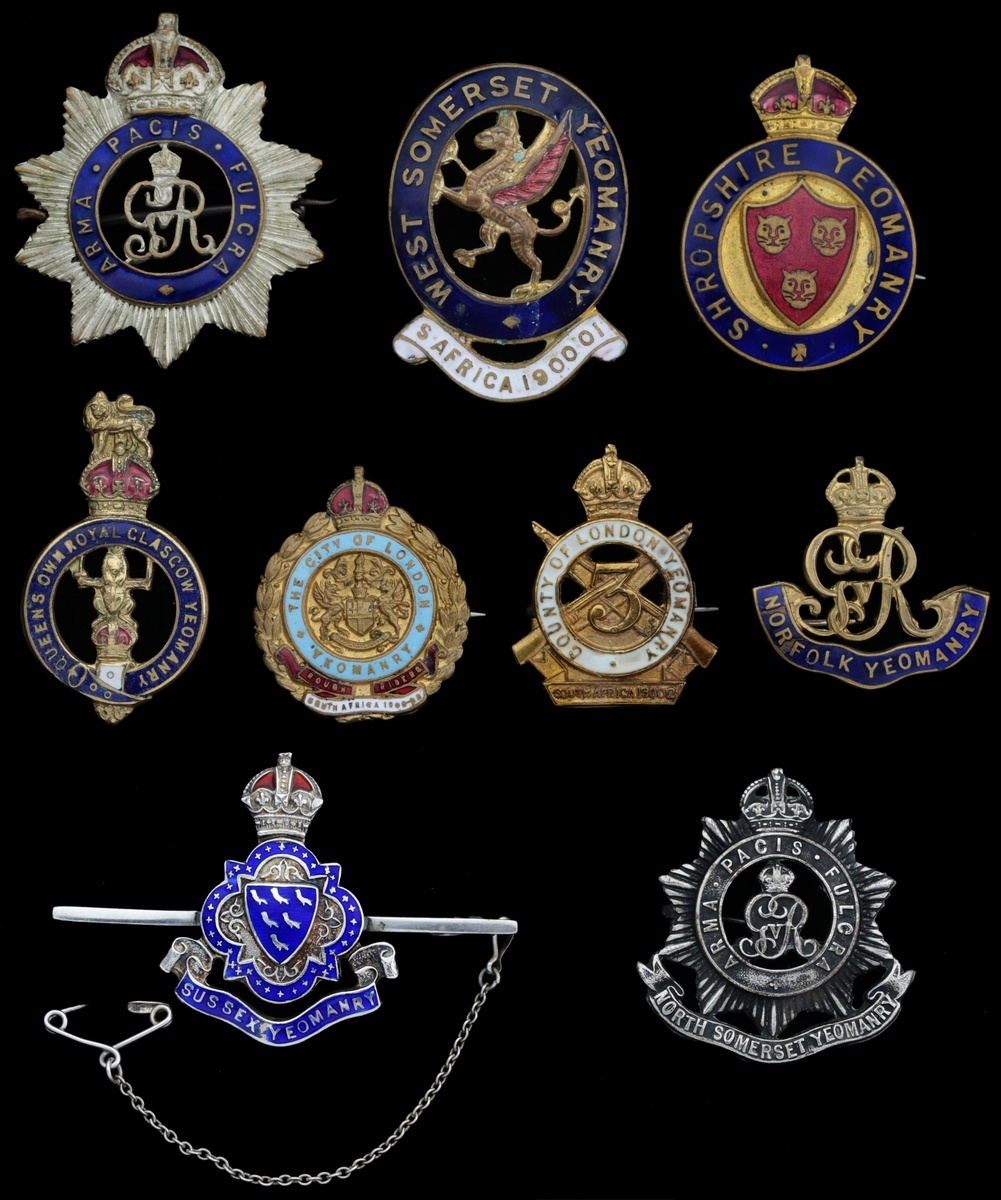 Norfolk Yeomanry, gilded base metal and enamel, 21mm, some enamel damage; Queen's Own Royal Glasgow Yeomanry, gilded base metal and enamel, 32mm; Shropshire Yeomanry, gilded base metal and enamel, 30mm; West Somerset Yeomanry, gilded base metal and enamel, 38mm; Sussex Yeomanry, silver and enamel, reverse marked 'Sterling', 33m, some enamel damage to title scroll; 3rd County of London Yeomanry, gilded base metal and enamel, 30mm; City of London Yeomanry, gilded base metal and enamel, 28mm; North Somerset Yeomanry, silvered base metal and enamel, 40mm, pin replaced; North Somerset Yeomanry, silver-coloured metal, 33mm, generally very fine and better (9)
