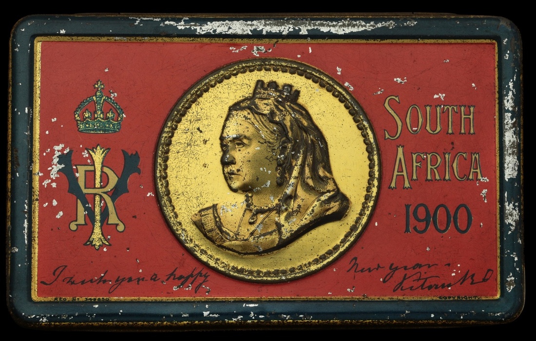 (x) South Africa 1900 Queen Victoria Christmas tin, chocolate present but broken, a little rubbing to tin, very fine and a good survivor