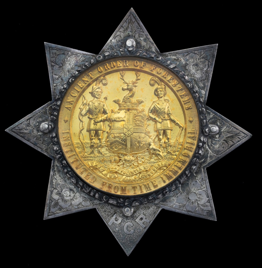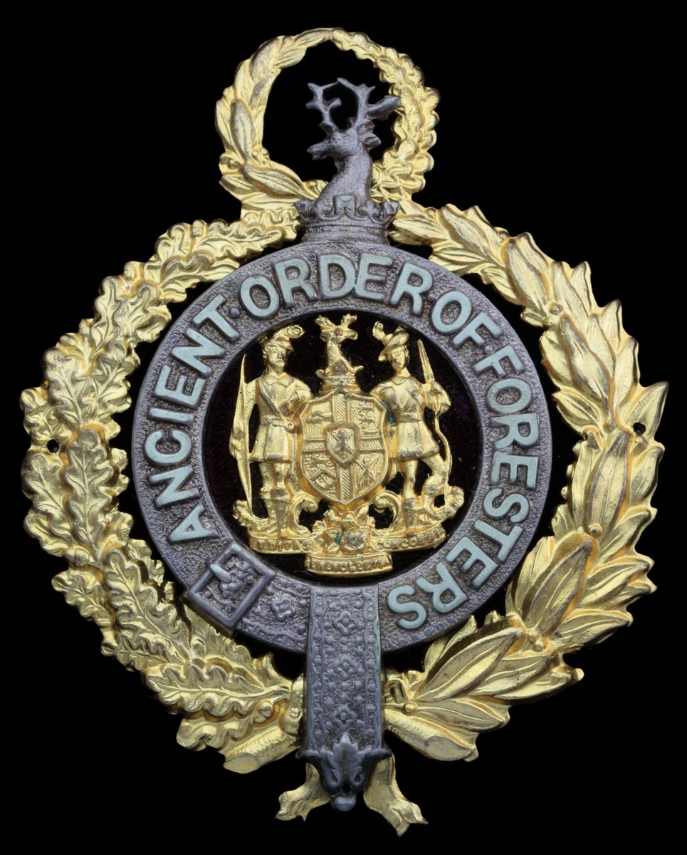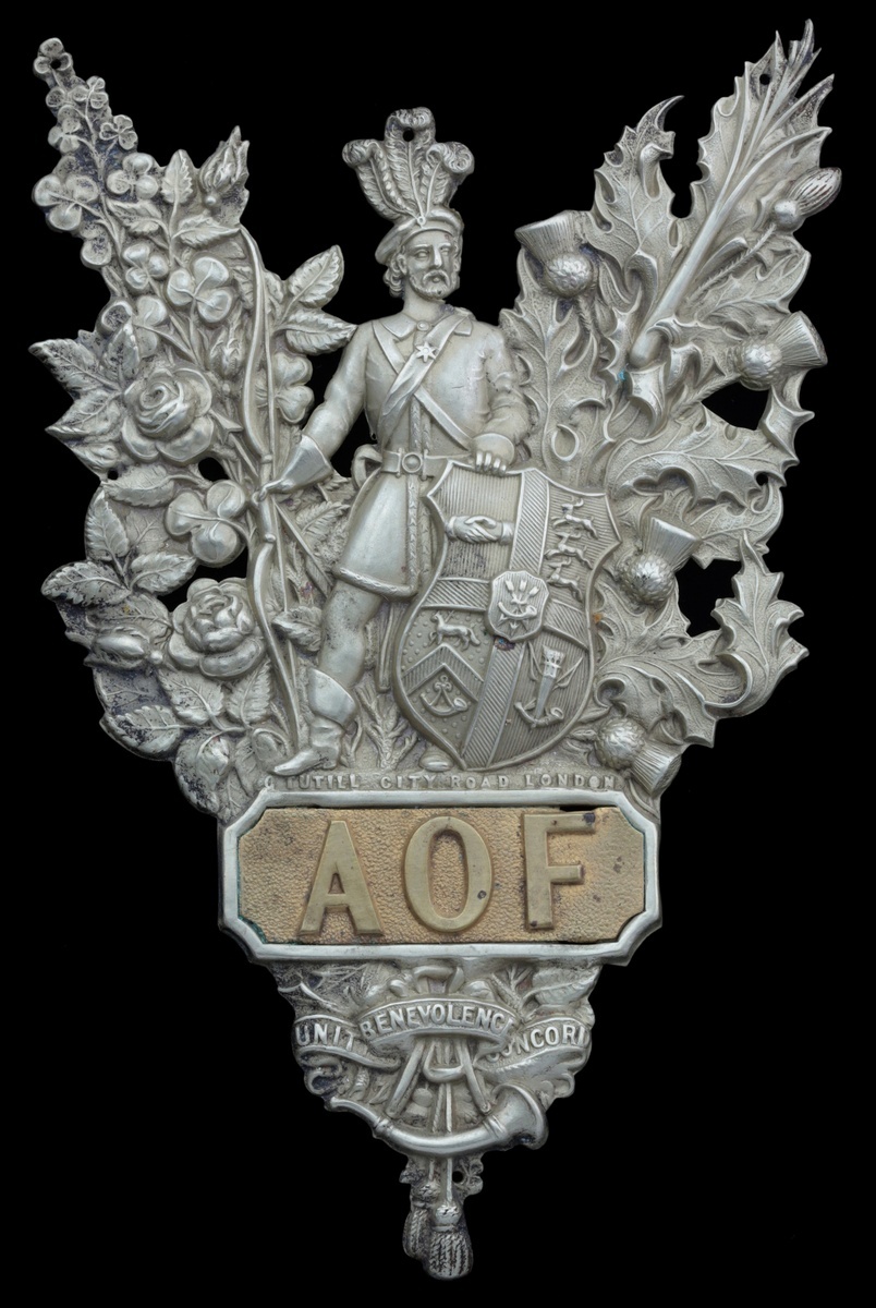 Comprising one star-shaped, silver with silver-gilt centre under glass lunette, hallmarks for London 1875, 87mm x 89mm; one within a wreath, bearing the badge of the Order to centre, silvered and gilded base-metal, reverse with manufacturers' details relating to 'George Tutill, Regalia Dept, 83 City Road, London', 80mm x 100mm; one featuring an archer surrounded by stands of national flowers, bearing the title 'A O F', white metal, 82mm x 136mm, good very fine (3)