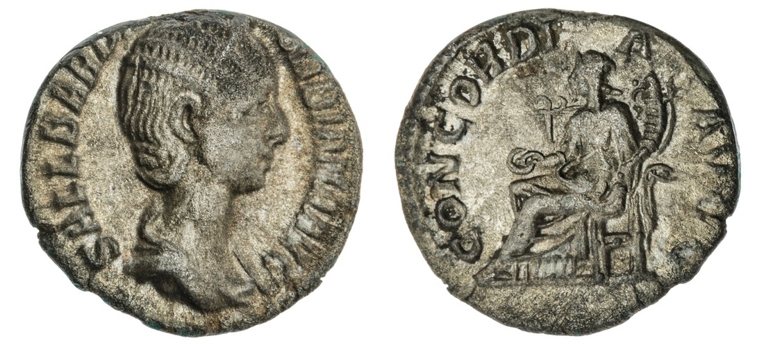 The Hanlon Collection | Roman Empire, Orbiana, Wife of Severus Alexander, 225-226AD, AR Denarius, diademed and draped bust to right rev Concordia seated to left, holding patera and double cornucopiae, 1.76g, (RIC IV 319 ; BMCRE 287 ; RSC 1.) toned, porosity to surface, verdigris to edge, nVF