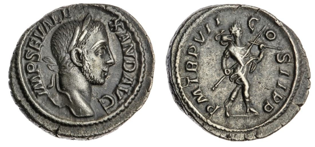The Hanlon Collection | Roman Empire Severus Alexander, 222-235AD, AR Denarius, 228AD, Laureate head Right, rev Emperor advancing right, holding trophy and spear 3.96g, (RIC IV 85 ; RSC 351) Struck on broad flan, dark toning, sharp details, EF