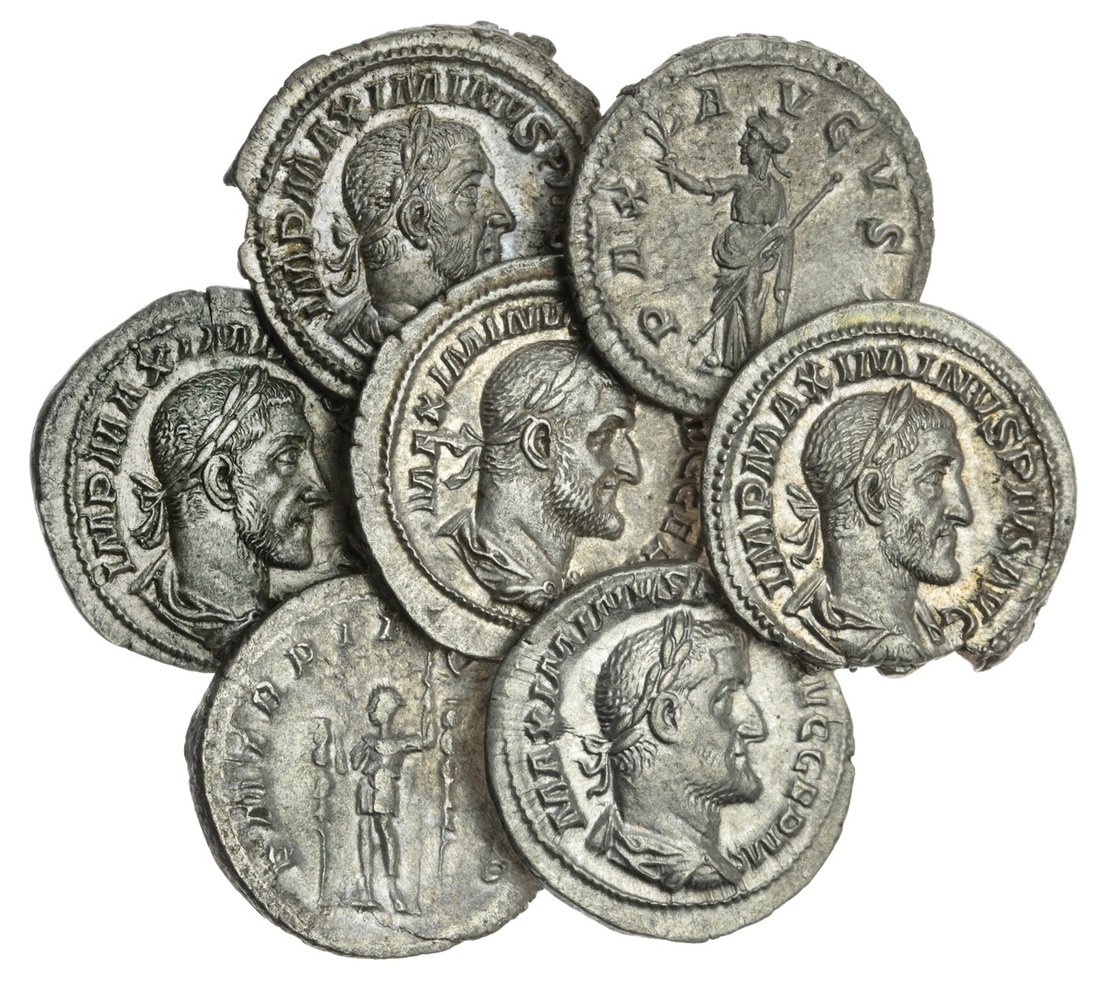 The Hanlon Collection | Roman Empire Maximinus I, 235-238, AR Denarii, (7), Bust of Maximinus right, laureate, bearded, rev Emperor between 2 standards, 2.67g (RIC 1) ; Victory running right, wreath in left hand, scepter in right, 3.18g, 3.08g, (2) (RIC IV 16) ; Pax standing left, holding branch in raised hand and transverse sceptre. 3.01g, 3.39g, (2) (RIC IV 12) ; Providentia standing l. holding wand over globe and cornucopia. 3.09g (RIC 13.) ; Fides Militum standing, holding two standards. 2.17g (RIC 18a), still all pleasingly struck up, extremely fine (7)